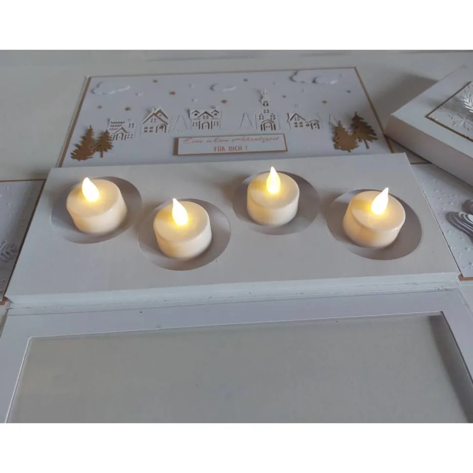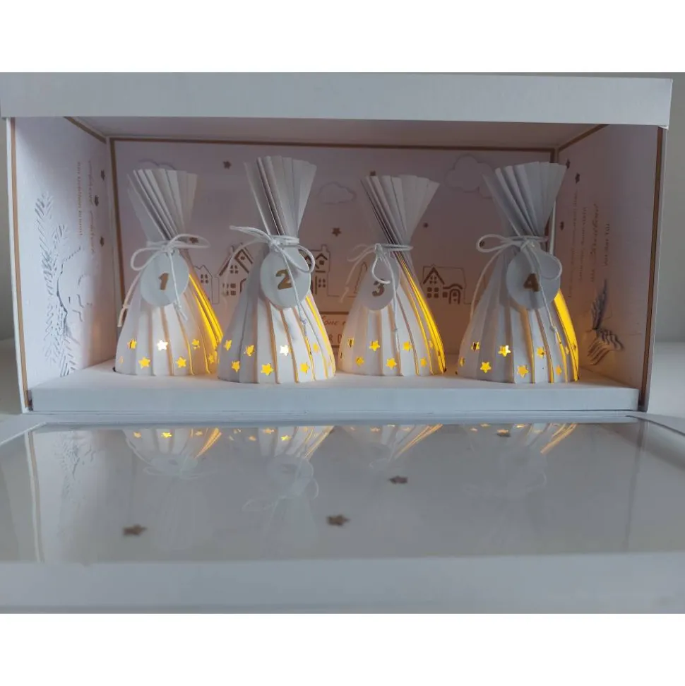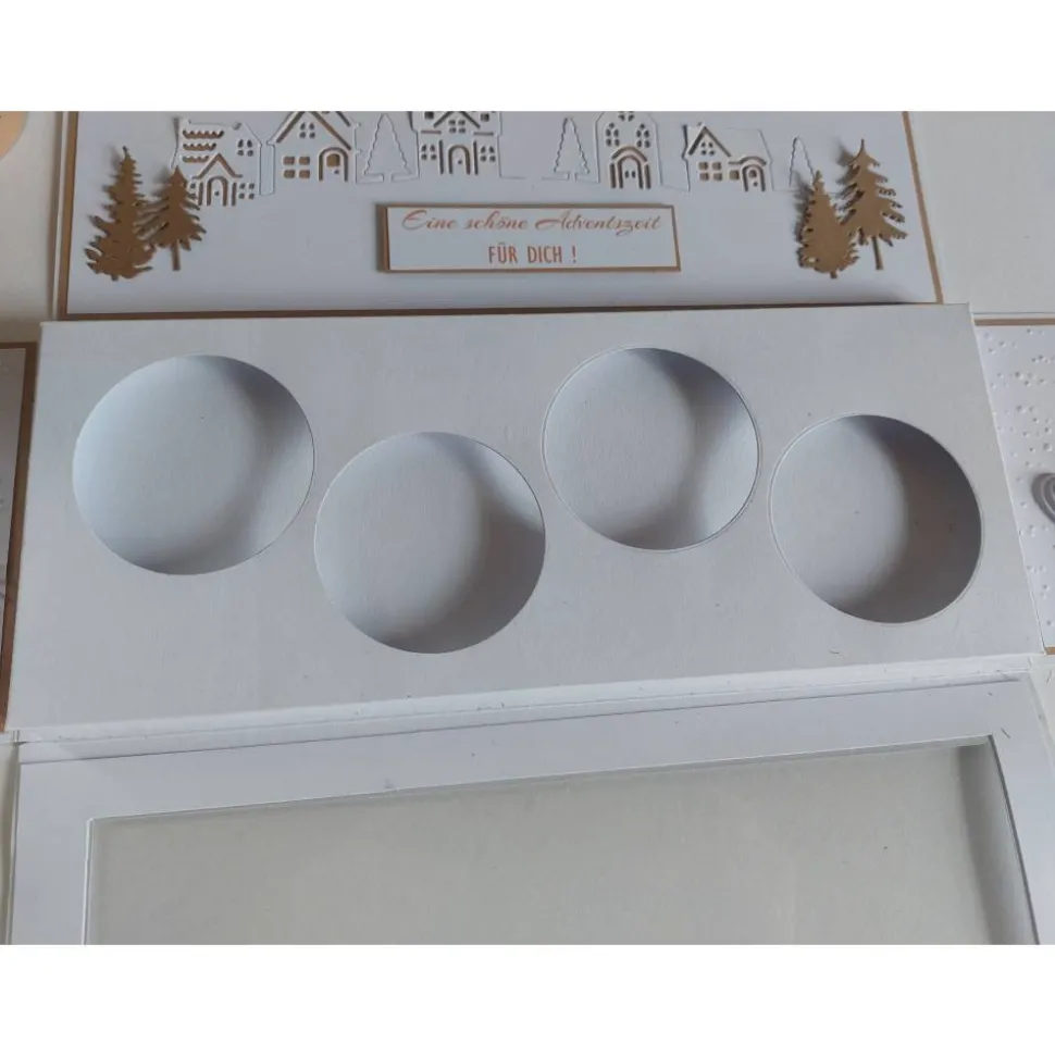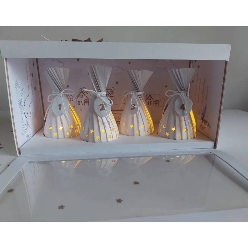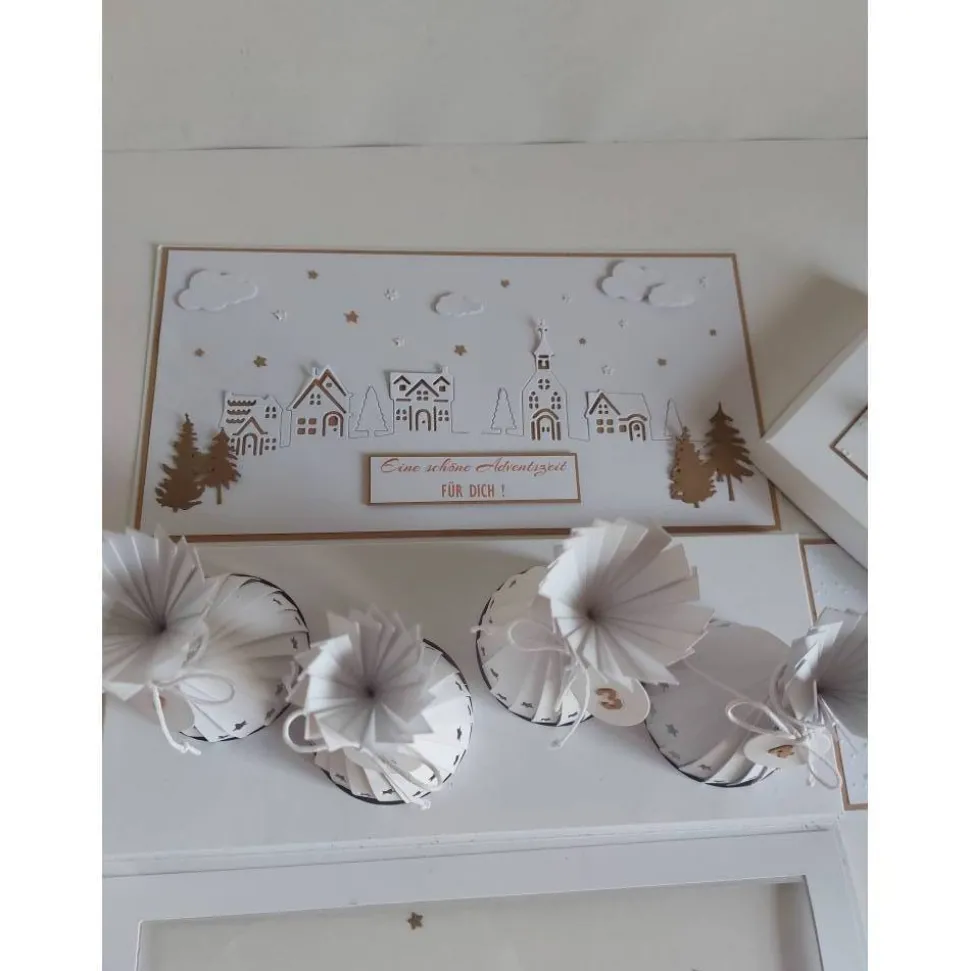 Jeder Lampion trägt eine Kordel mit Anhänger, auf denen die Adventswochen angebracht sind. Im Inneren der Box findest du auf der breiten Fläche die filigranen Umrisse eines Winterdorfes. Die seitlichen Wände sind mit einem schönem Spruch, einem Engel und Flügeln liebevoll verziert.