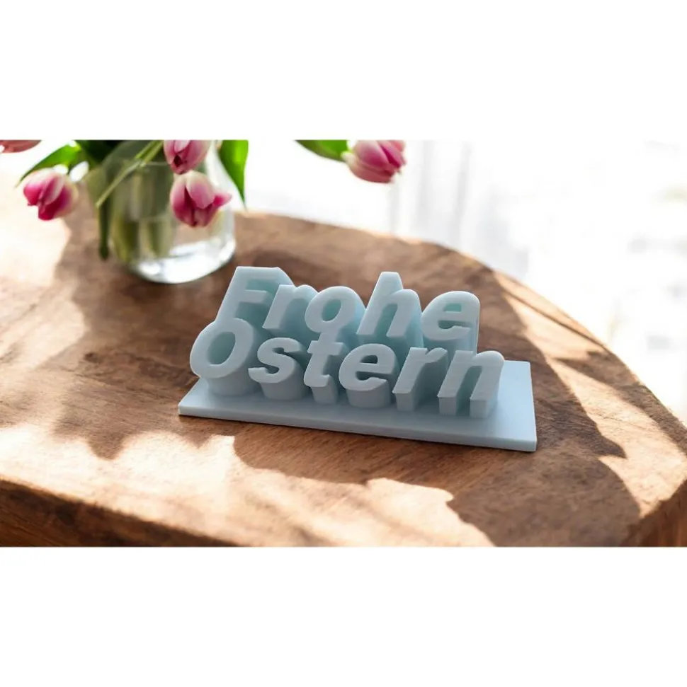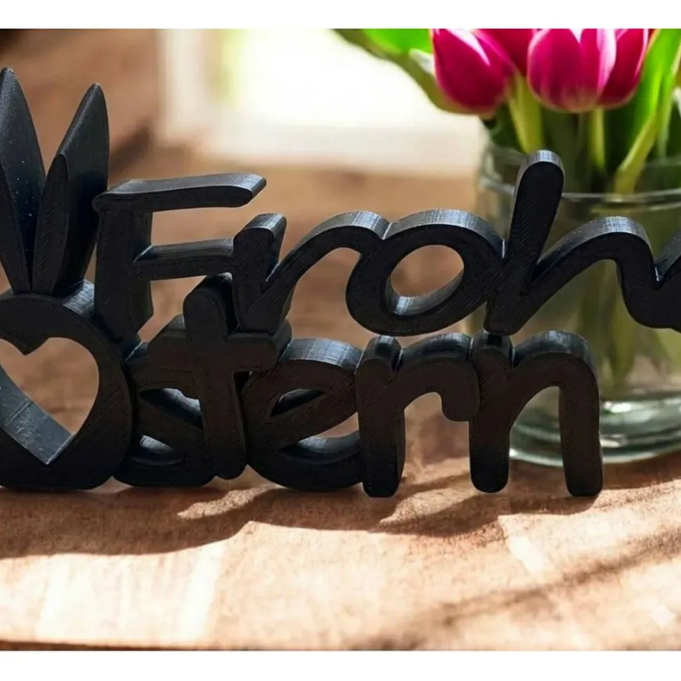 Verleihe deiner Frühlingsdekoration eine persönliche Note mit unserem „Frohe Ostern“ Schriftzug. Dieser Aufsteller kombiniert elegante, geschwungene Typografie mit liebevollen Details: Einem kleinen Herz und frechen Hasenohren, die direkt in die Buchstaben integriert sind. Dank der stabilen 3D-Druck-Bauweise steht der Schriftzug sicher auf jeder ebenen Fläche.