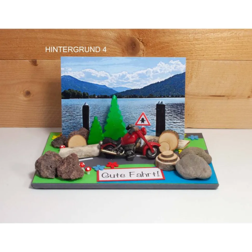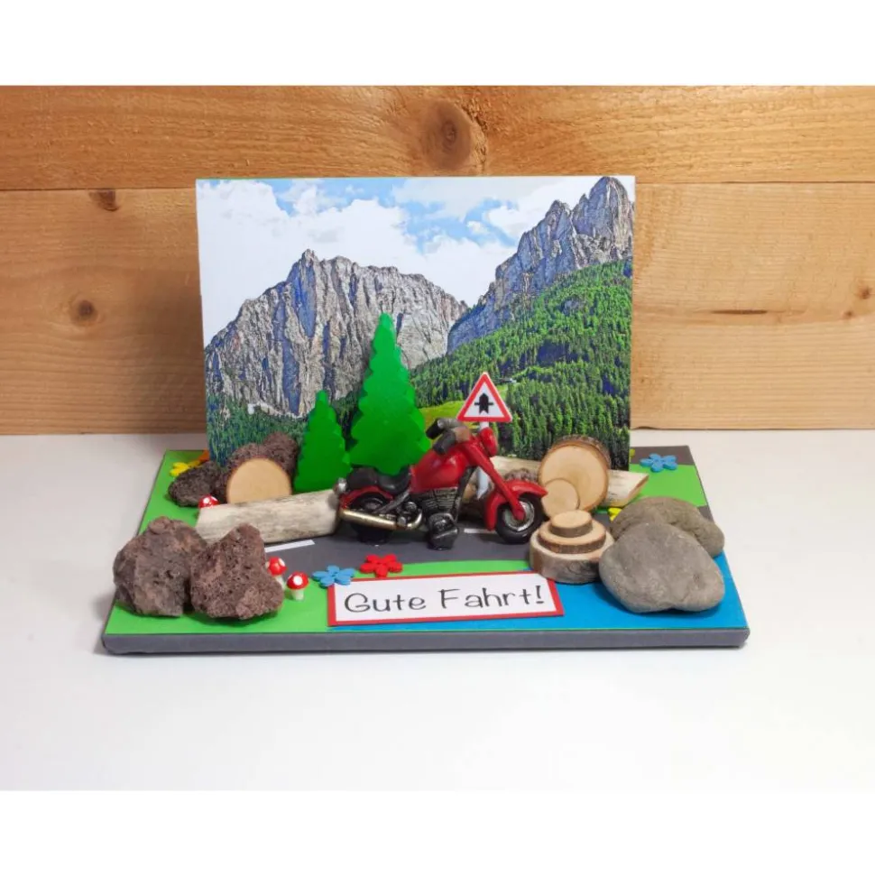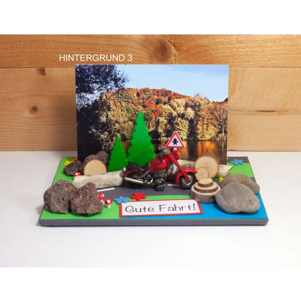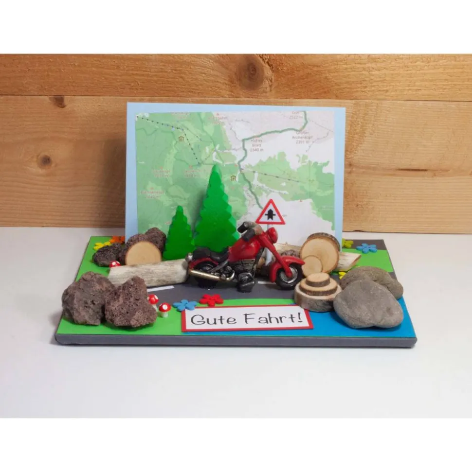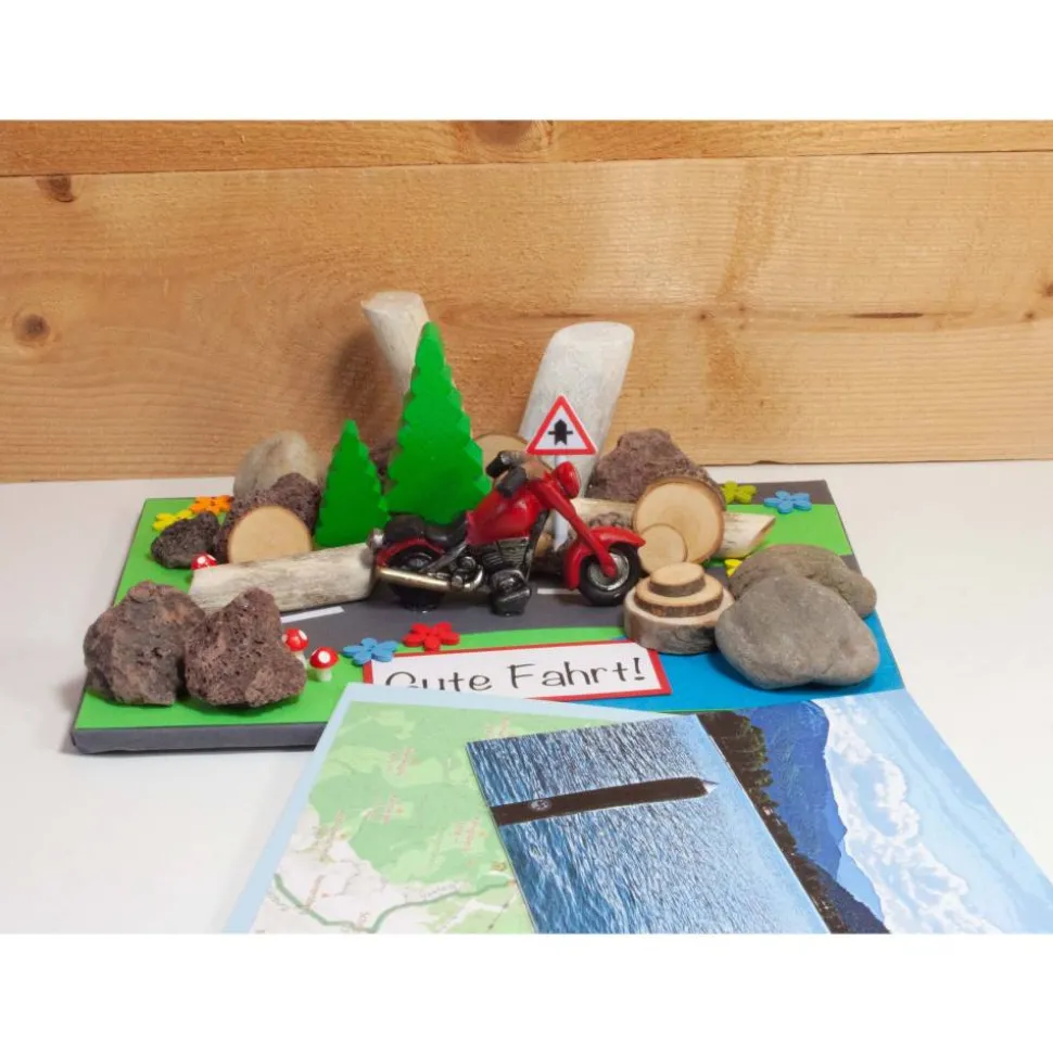 Geschäumte Pappe, Fotokarton, Motorrad Polyresin, Umschlag + Karte, Lavasteine, Steine, Streublümchen, Treibholz, Pilze Kunststoff, Baum Holz, Kork, Verkehrsschild Kunststoff und Metall.