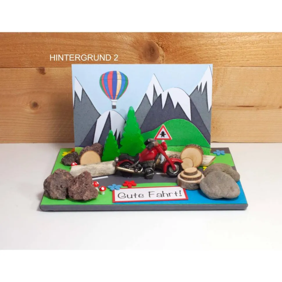 Karte für Gutschein oder Geldgeschenke, aufwendig und mit Liebe gestaltet, mit einem Motorrad.zum Thema: Motorrad fahren, Motorrad Tour, Motorrad Zubehör, Berge, Urlaub, Ruhestand, Hochzeitsreise, Männer Geschenk, Hobby, usw.