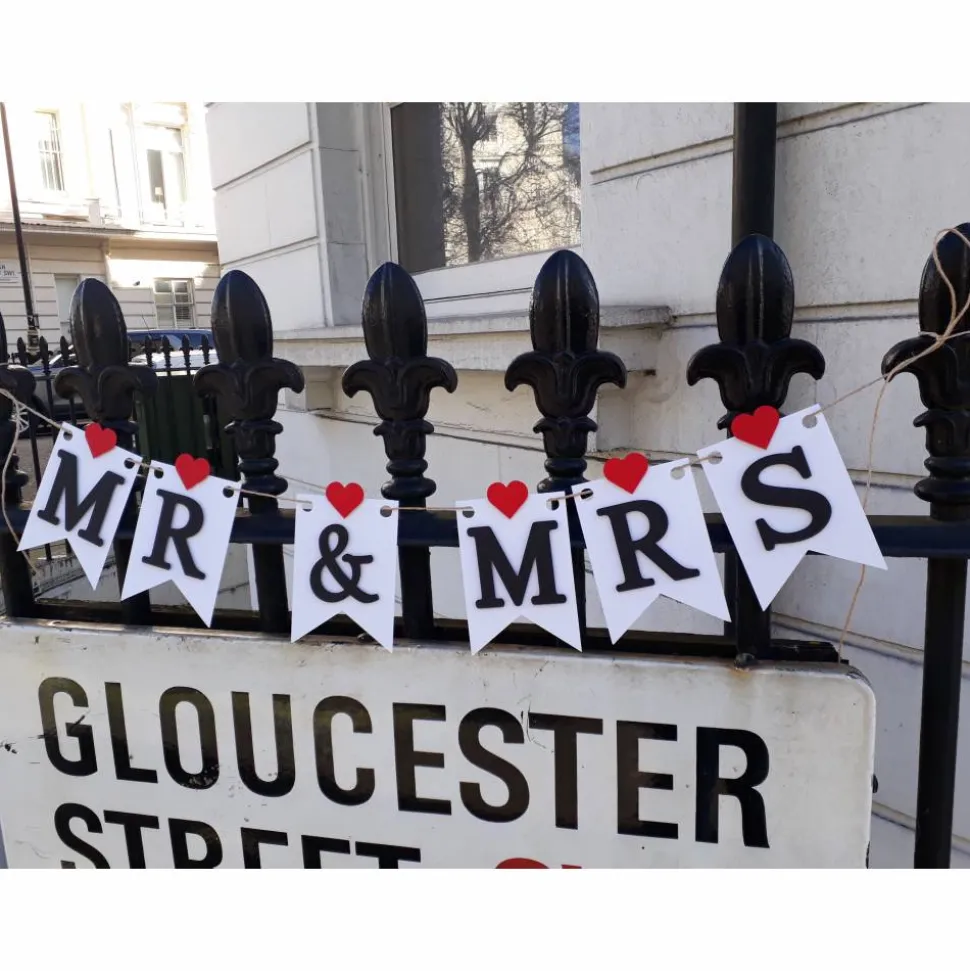 Die Grundfarbe der Girlande ist weiß, die Schrift in schwarz aufgesetzt und die Oberseite der Wimpel ist mit roten Herzen verziert. Durch eine spezielle Klebetechnik hat die Schrift eine besondere 3 D Wirkung und ist plastisch hervorgehoben.
