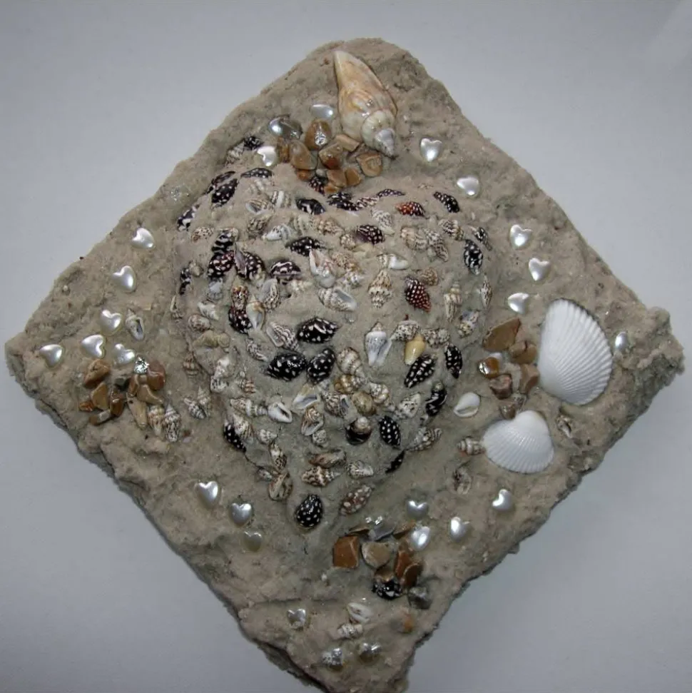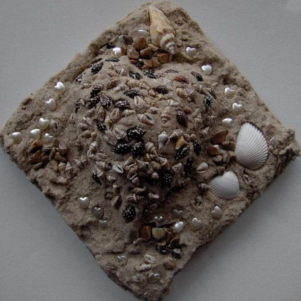 Sand, Muscheln, Herzperlen liebevoll auf einem Keilrahmen gestaltet.