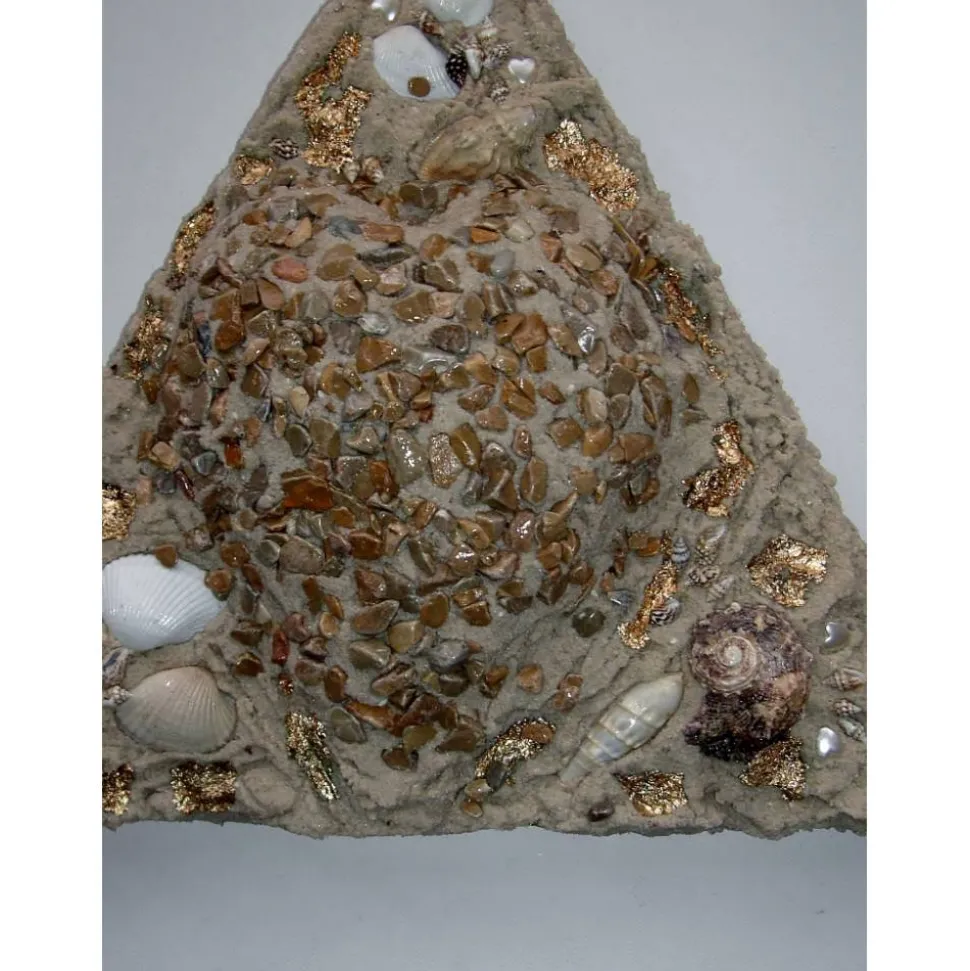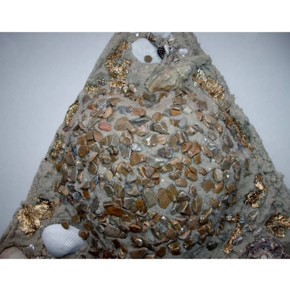 Sand, Blattmetall, Muscheln, Steine, Perlen in Herzform und vieles mehr, liebevoll auf einem dreieckigen Keilrahmen gestaltet.