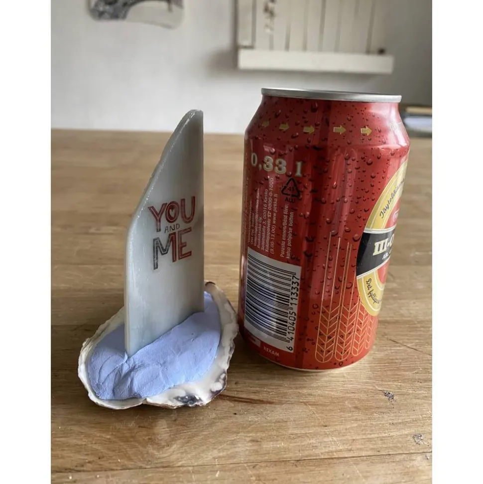 Die Muschel für das Boot haben wir am Nordseestrand gefunden. Sie wurde gründlich gereinigt. Das Segel besteht aus Tiffanyglas mit einem kleinen Schild beklebt. Das Segel ist durch Modelliermasse fest in der Muschel befestigt.
