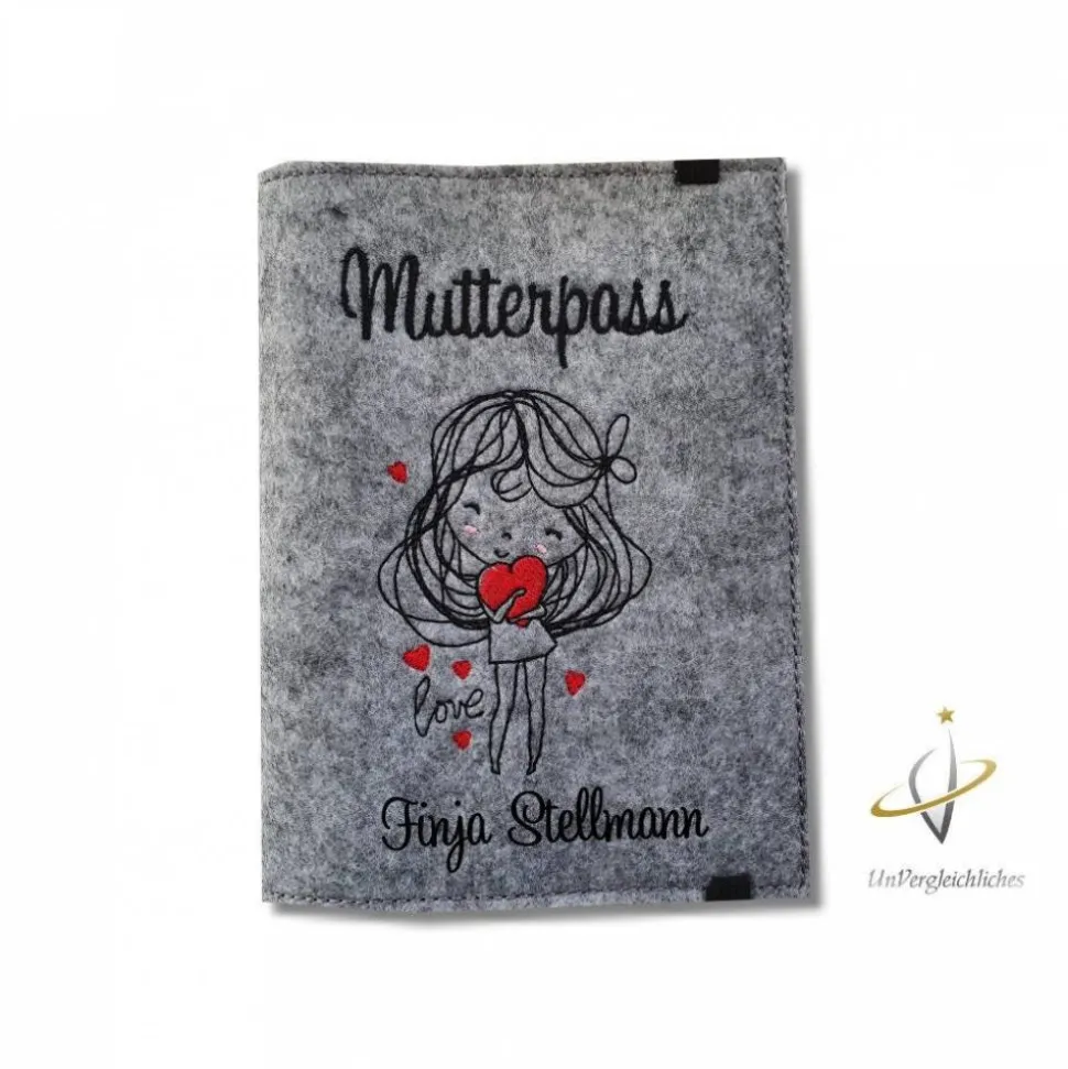 ♥ Die Mutterpasshülle ist aus 2 mm dickem Filz genäht und aufwändig bestickt. Ein Gummiband auf der Rückseite (so ist die tolle Bestickung auf der Vorderseite sichtbar) hält die Hülle fest zusammen, so dass kein Terminszettel oder Ultraschallbild verloren geht.♥