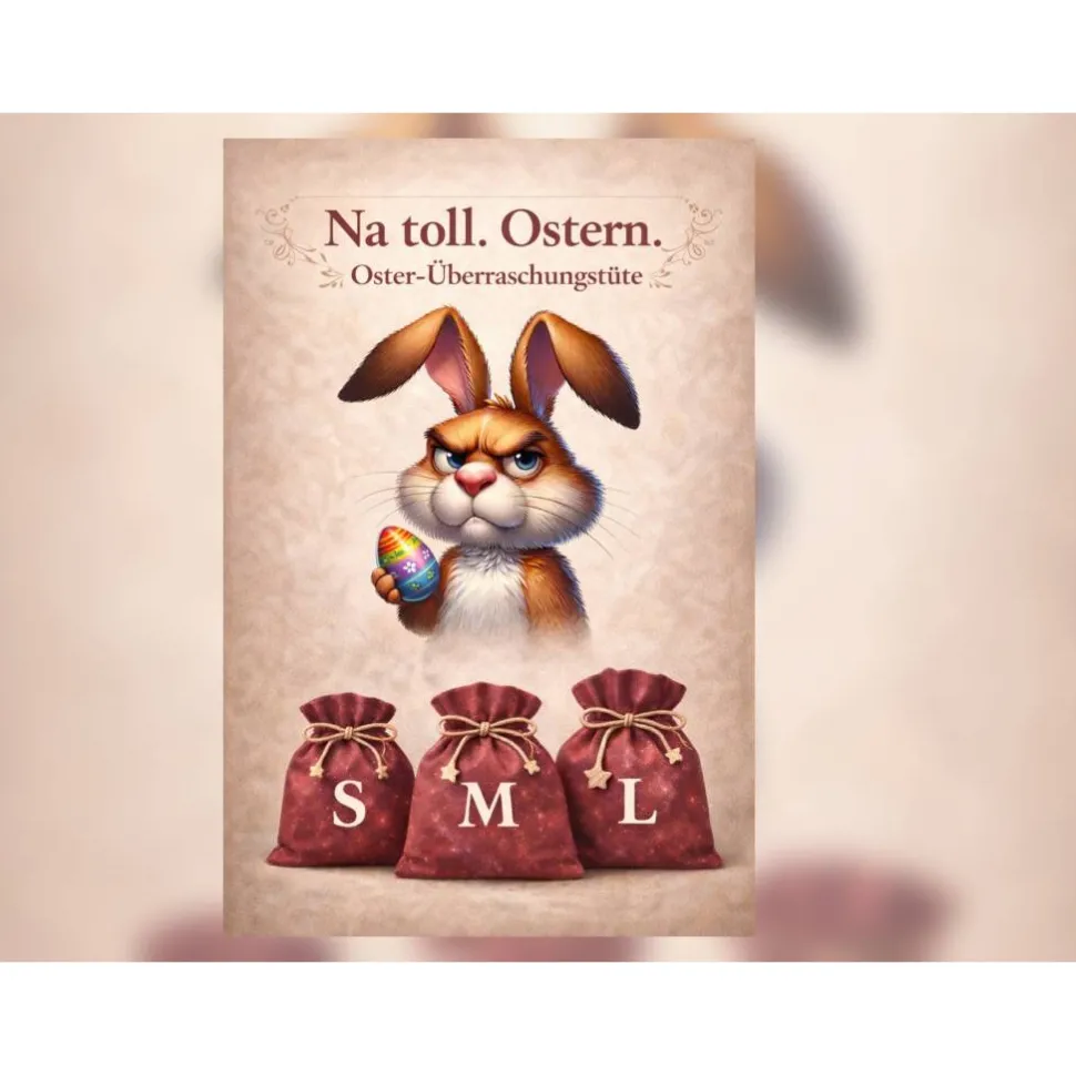Na toll. Ostern. Du hast keine Lust auf kitschige Osterdeko und suchst trotzdem ein originelles Geschenk? Dann ist die Na Toll Ostern Überraschungstüte genau das Richtige für dich! Diese freche Anti-Oster-Tüte ist ideal für alle, die Ostern lieber sarkastisch als zuckersüß feiern und Wert auf Individualität legen.