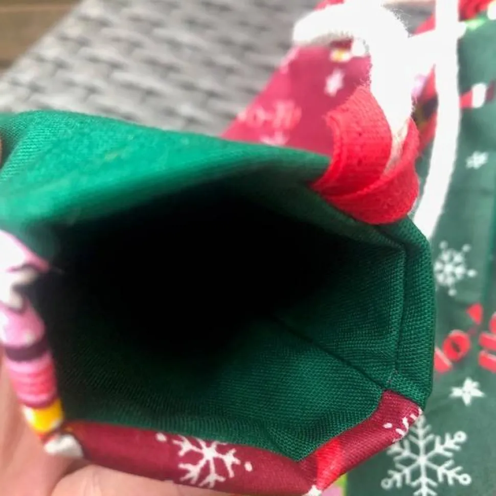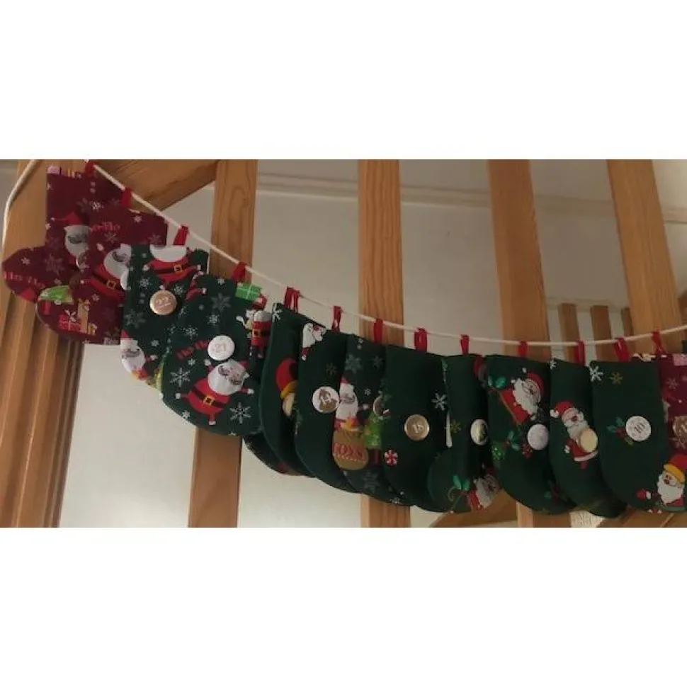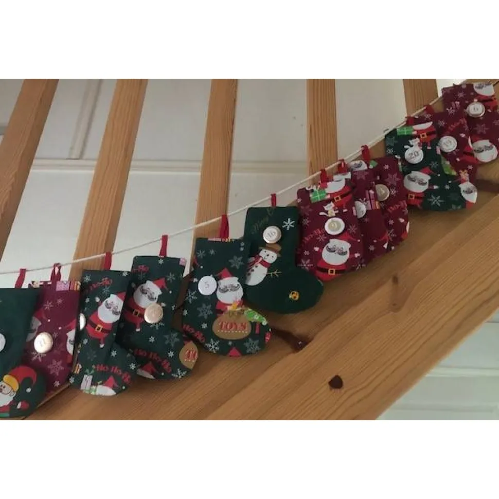 Jedes der 24 selbstgenähten Söckchen überzeugt durch eine doppelte Naht und vier Lagen Stoff und ist in klassischen Weihnachtsfarben gehalten: 8 Socken in Rot, 16 in Grün. Die Innen- und Rückseite ist in sattem Weihnachtsgrün gestaltet und sorgt für eine festliche Optik.