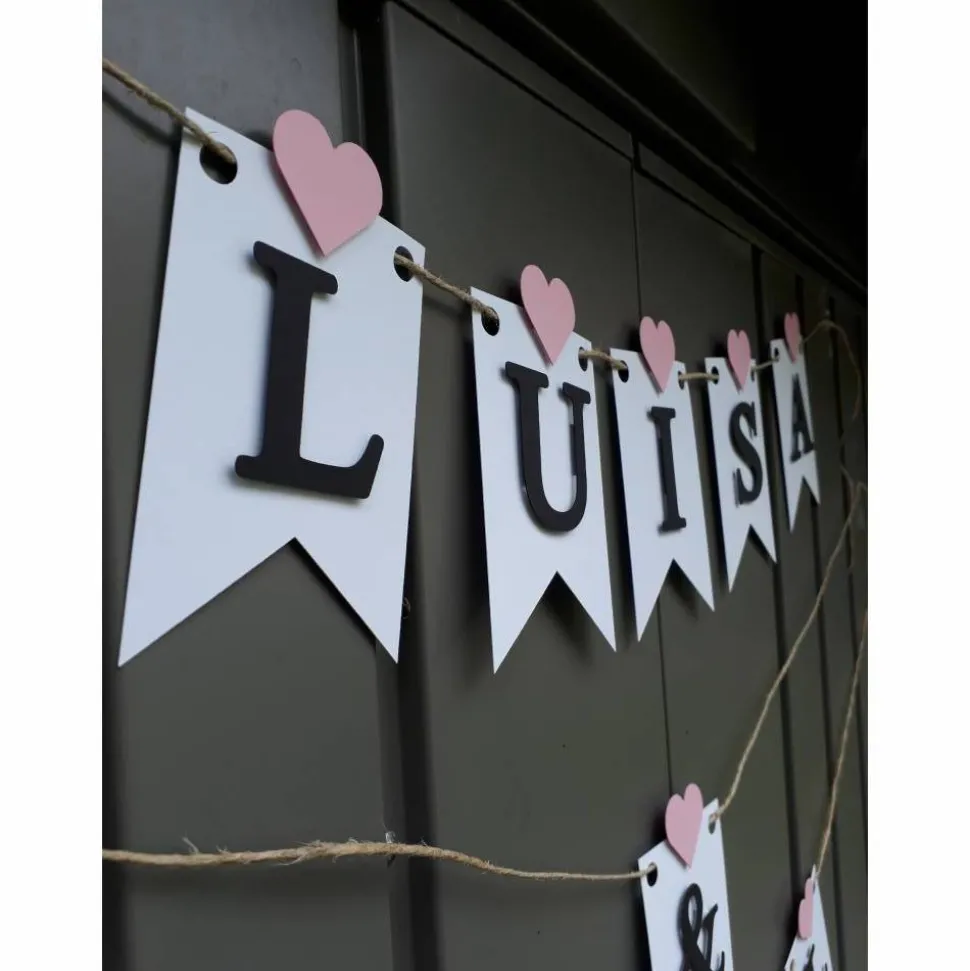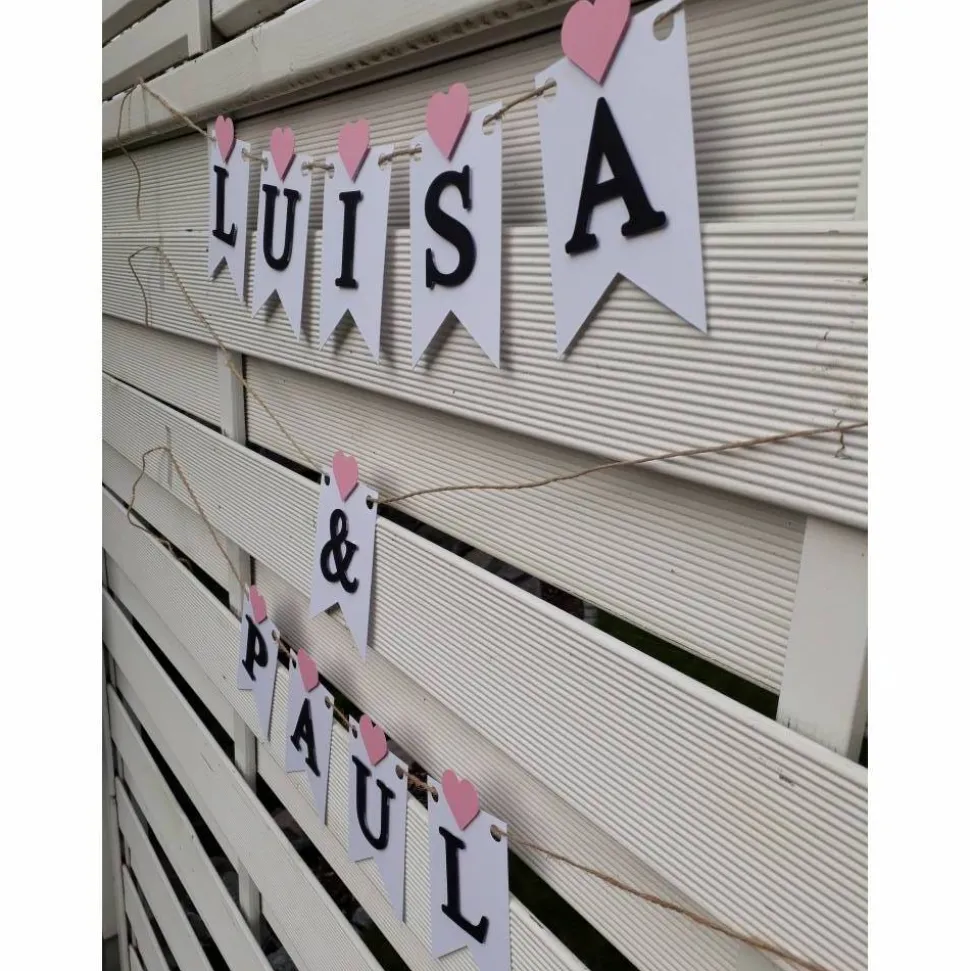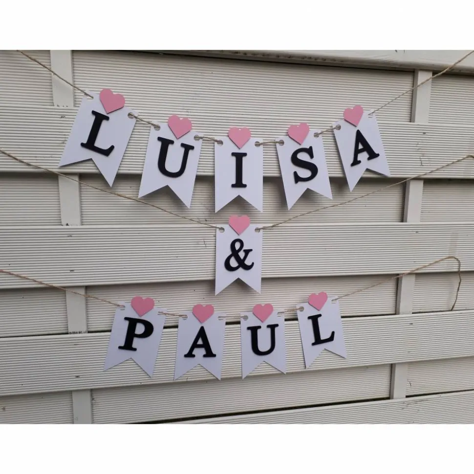 Die Girlande besteht aus weißen Wimpeln mit schwarzer aufgesetzter Schrift und rosa Herzchen über jedem Buchstaben. Zu den beiden gewünschten Namen beinhaltet das Angebot noch ein &-Zeichen. Durch die aufgesetzte Schrift bekommt die Girlande einen besonderen 3D Effekt.