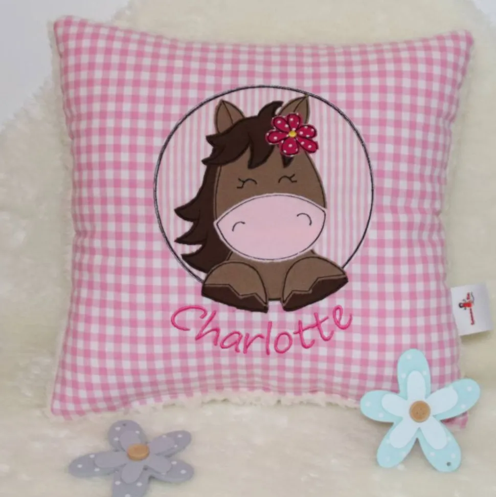 Namenskissen mit einer niedlichen Doodle Stickerei Pferdchen und den Namen des Kindes.