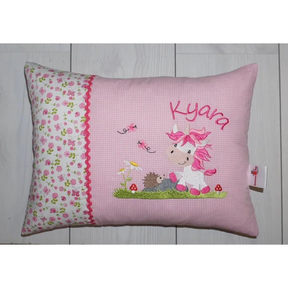 Süßes Kuschelkissen mit Stickbild „Einhorn mit Igelchen“ und Namen des Kindes. Seitlich Stoff Herzen, unter Stickerei Baumwollstoff rosa Vichy. Kissen besteht aus Hülle & Inlett.