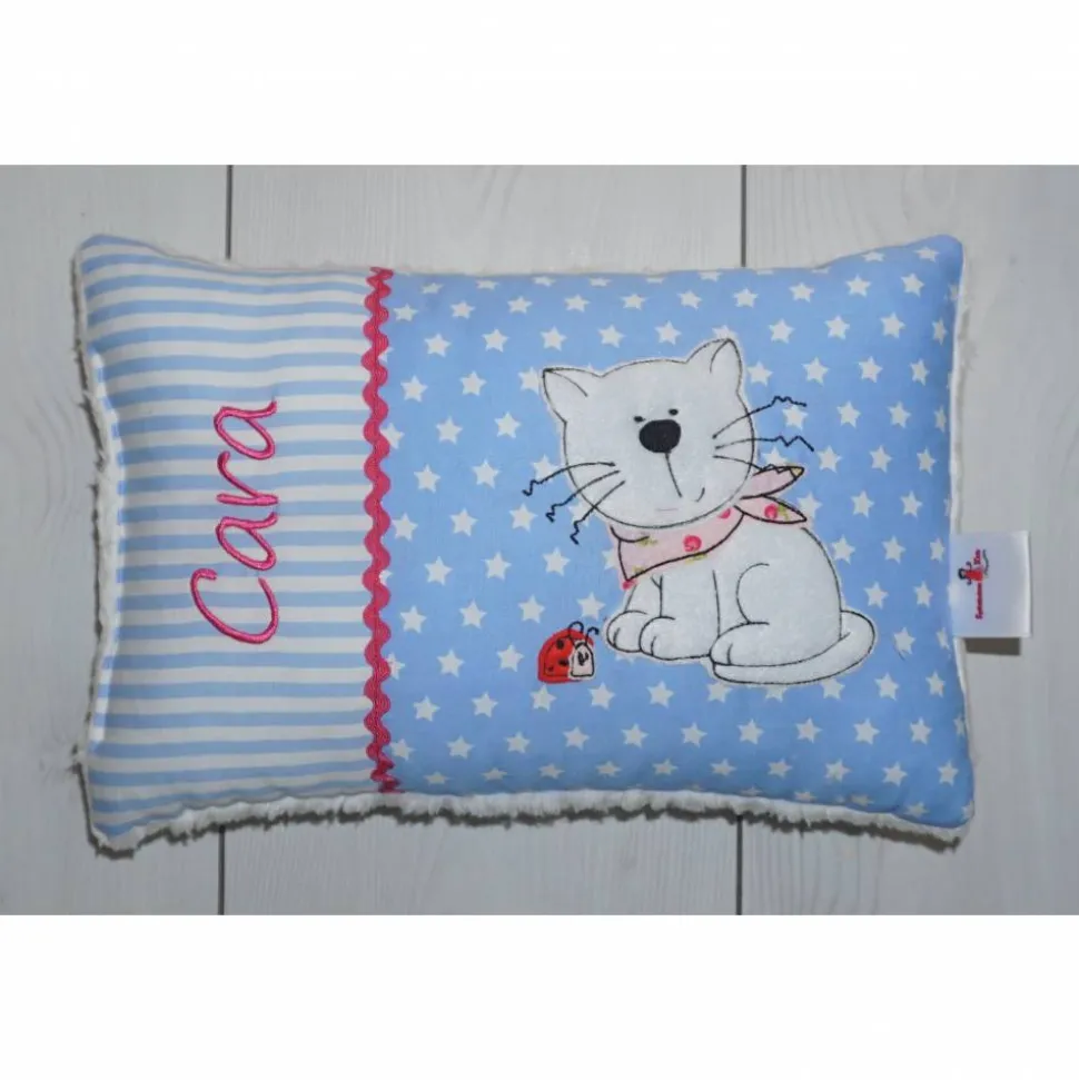 Süßes Kuschelkissen mit Doodle Stickerei Katze mit Marienkäfer und Namen des Kindes. Seitlich Stoff Streifen.