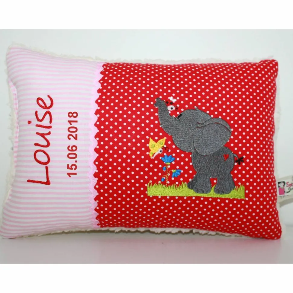 Vorderseite Baumwollstoff Streifen und Punkte, Stickbild Elefant Vollstickerei und auf der Rückseite Teddystoff.