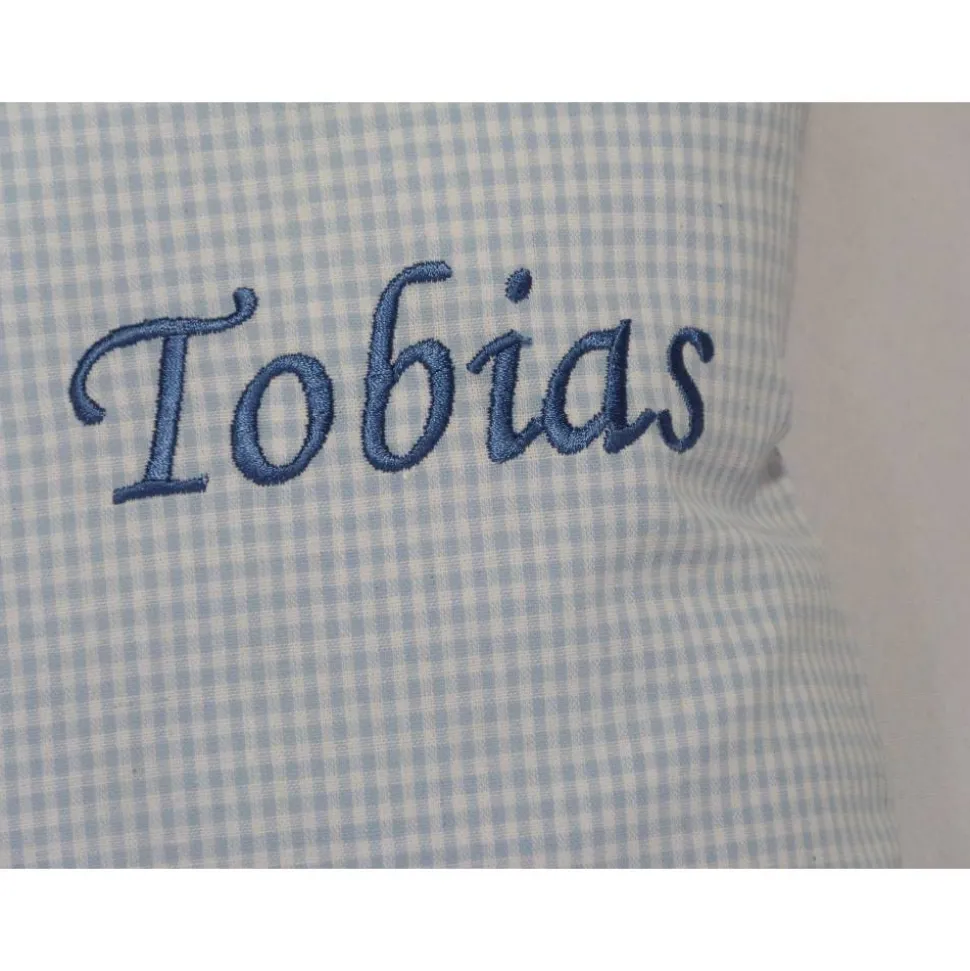 Ein Kissen aus Baumwolle mit Namen und Datum.Die Kissenfüllung ist aus Polyester.