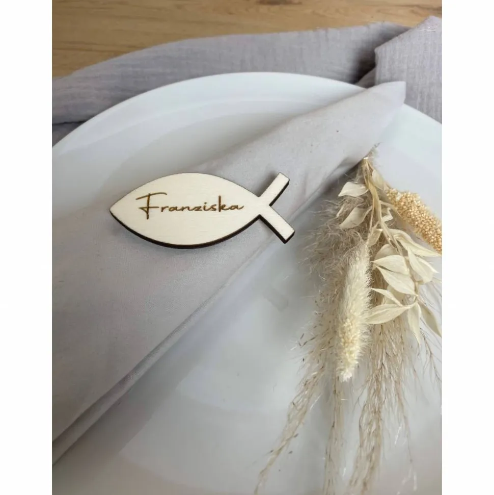 Namensschilder Fische Taufe, Kommunion, Konfirmation / Tischdekoration Tischkarten personalisiert mit Namen aus Holz