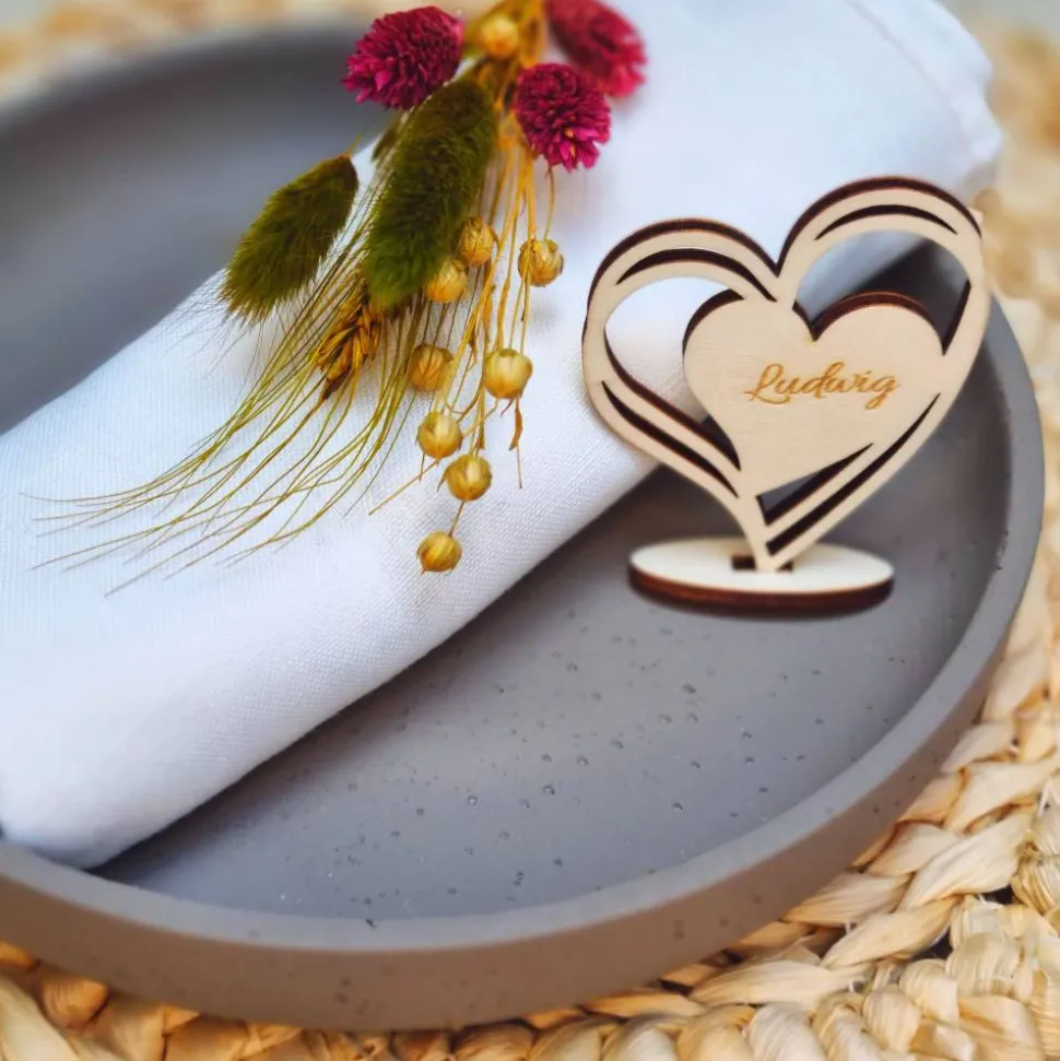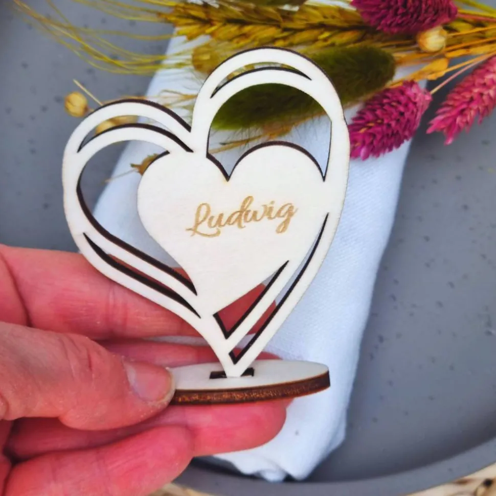 Unsere personalisierten Namensschilder für Hochzeiten sind die perfekte Ergänzung für deine Tischdekoration. Jede Platzkarte wird aus hochwertigen Materialien gefertigt und kann nach deinen Wünschen personalisiert werden. Ob rustikal, elegant oder modern – unsere Namensschilder passen sich jedem Hochzeitsstil an. Sie sind zudem ein wunderbares Gastgeschenk für deine Gäste. Gestalte deine Hochzeit mit diesen einzigartigen und stilvollen Tischkarten, die nicht nur funktional, sondern auch ein echter Hingucker sind.