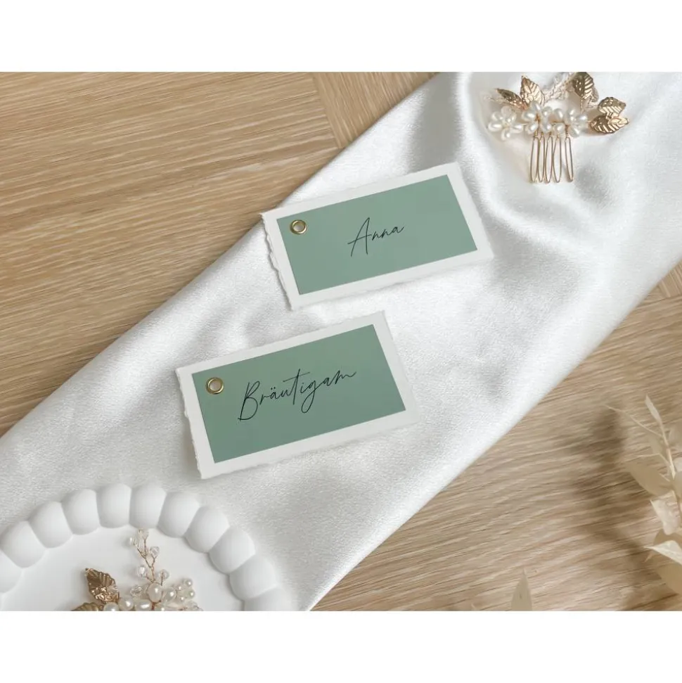Diese Namenskarten sind aus hochwertigem Strukturpapier mit handgerissenen Kanten und einem Farbpapier mit den jeweiligen Namen. Gesamtmaße ca. 5 x 9 cm.
