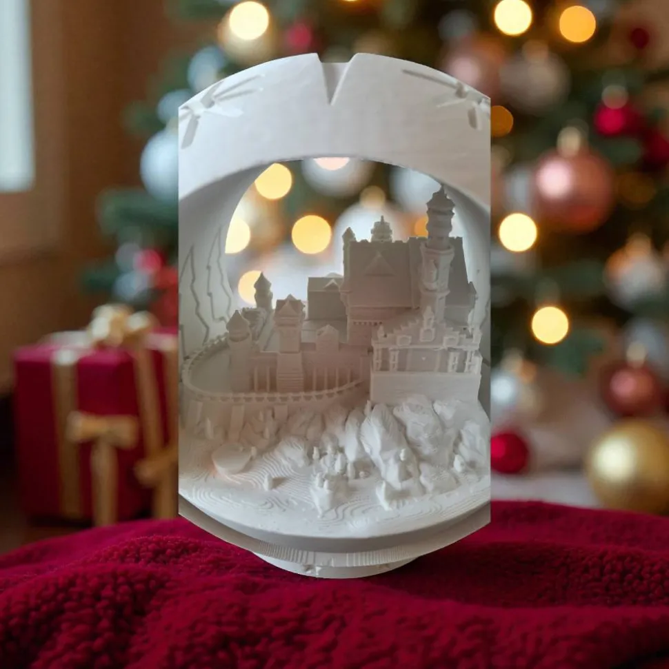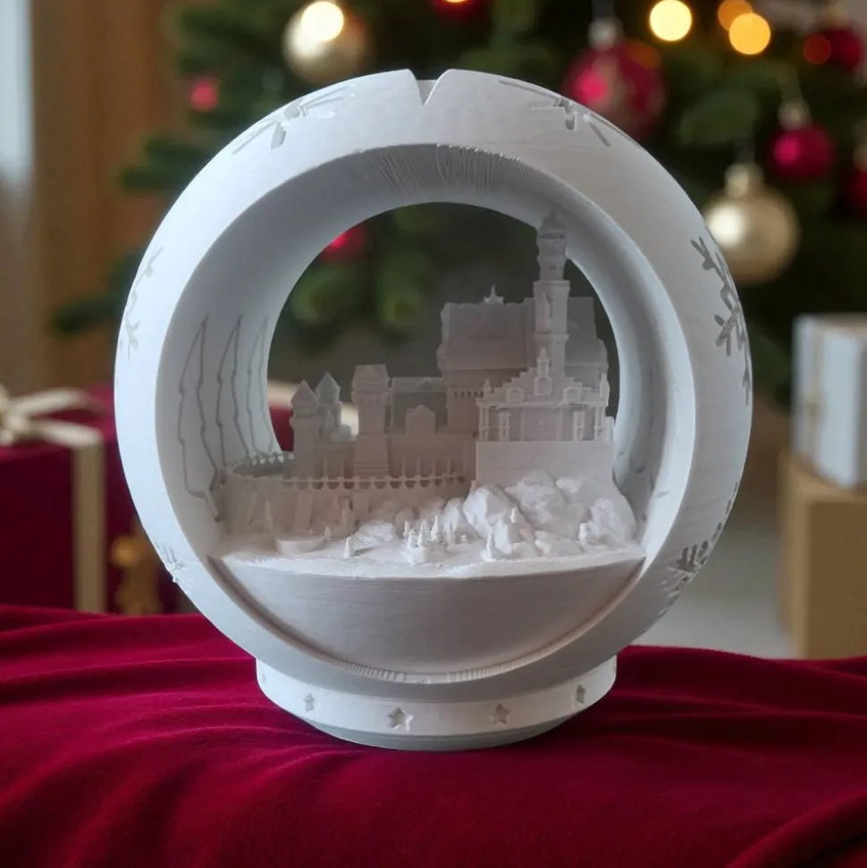 Tauchen Sie Ihr Zuhause in einen märchenhaften Weihnachtsglanz mit dieser einzigartigen, 3D-gedruckten Windlicht Kugel! Im Inneren der Kugel verbirgt sich eine detailgetreue Miniatur des weltberühmten Schloss Neuschwanstein .