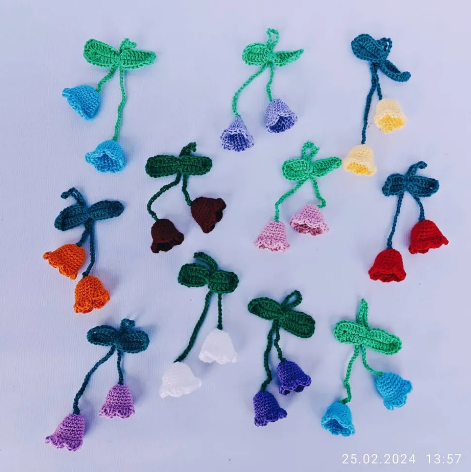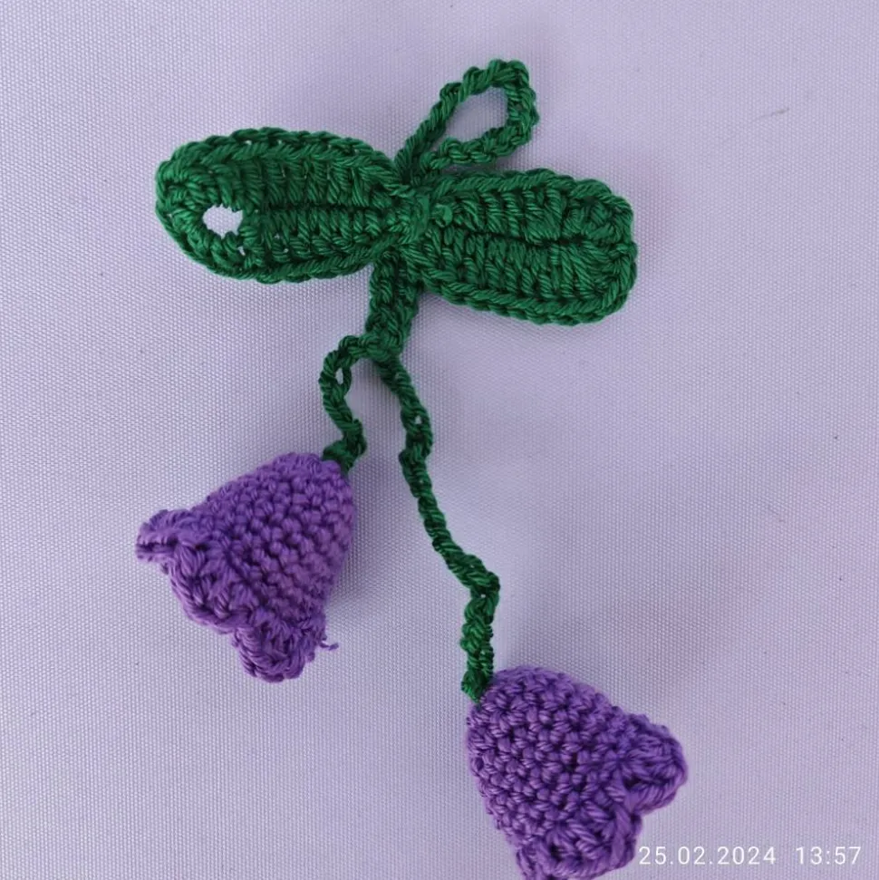 jede Glockenblume ist 2 cm groß, (2 Glockenblumenblüten am Stiel) hat ein grünes Blatt und eine Schlaufe zur Befestigung
