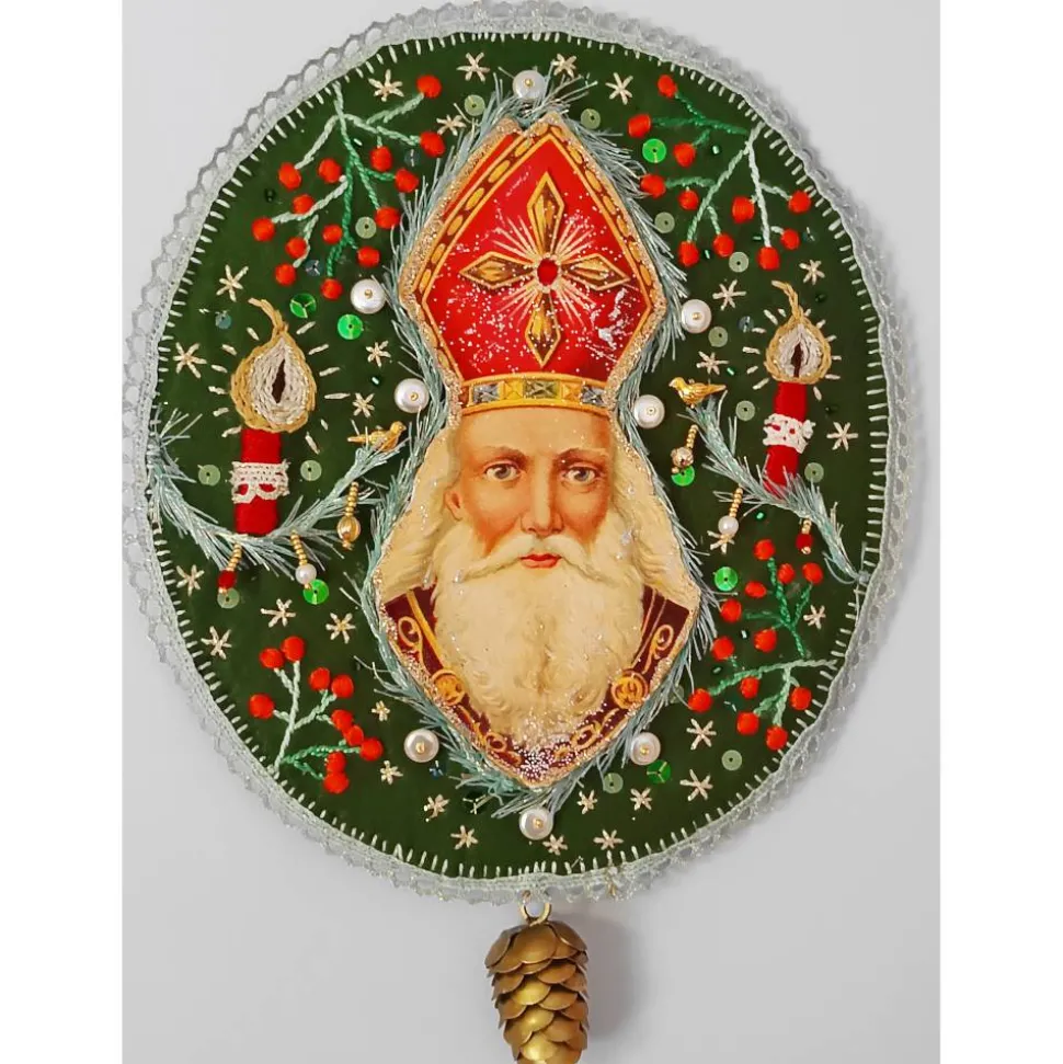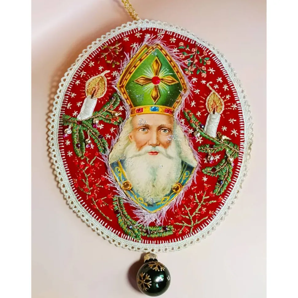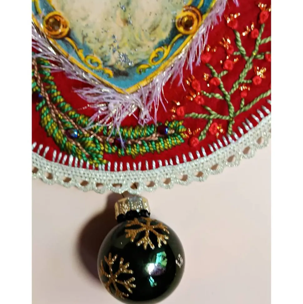 Entdecke eine besondere Weihnachtsdekoration: Das handgemachte Nikolaus-Bild ist eine detailreiche Mixed Media Collage zum Aufhängen. Dieses Kunstwerk für die Wand kombiniert roten Filz, Karton, Papier, Stickgarn, Perlen sowie eine edle, cremefarbene Spitzenborte. Ein Bändchen aus goldfarbener Zackenborte zum Aufhängen und eine kleine dunkelgrüne Weihnachtskugel am unteren Ende machen das Bild zu einem echten festlichen Blickfang.