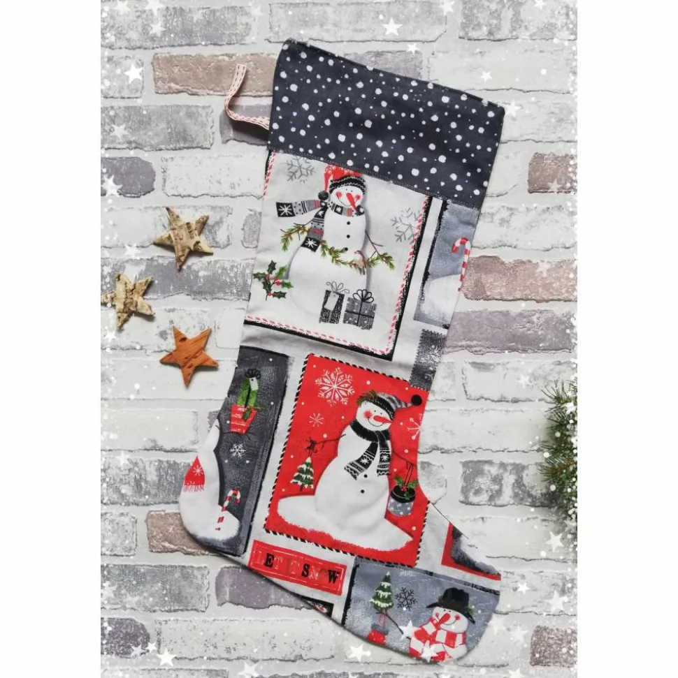 Der Stiefel ist etwa 36 cm hoch. Der Stoff hat ein tolles Schneemann-Muster in grau/rot, oben ist ein Stoff in grau mit Schneeflocken. Für den Innenstiefel habe ich einen Baumwollstoff verwendet.