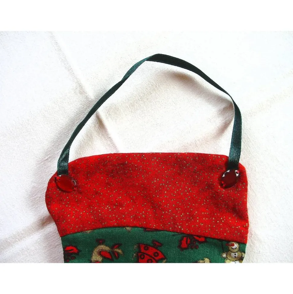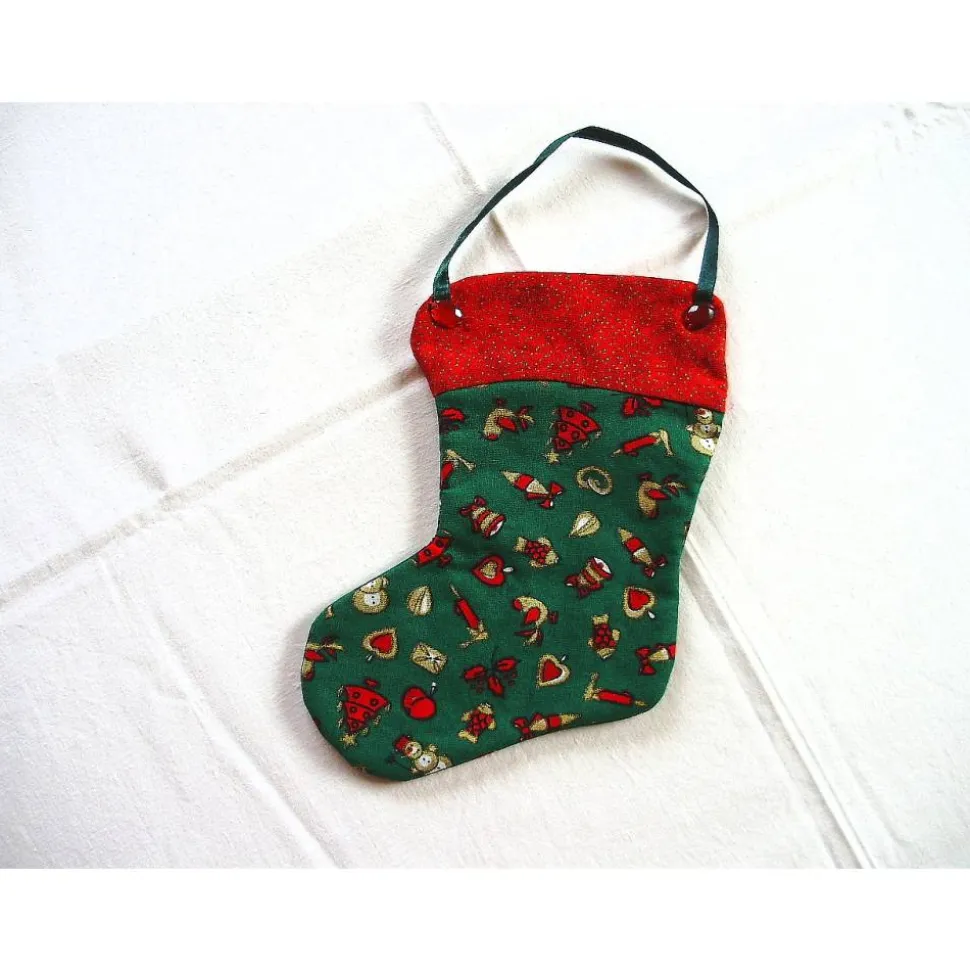 Der genähte Dekohänger ist aus einem tannengrünen Baumwollstoff mit weihnachtlichen Motiven. Der Stiefelschaft ist aus einem roten Baumwollstoff mit kleinen, goldenen Punkten abgesetzt.