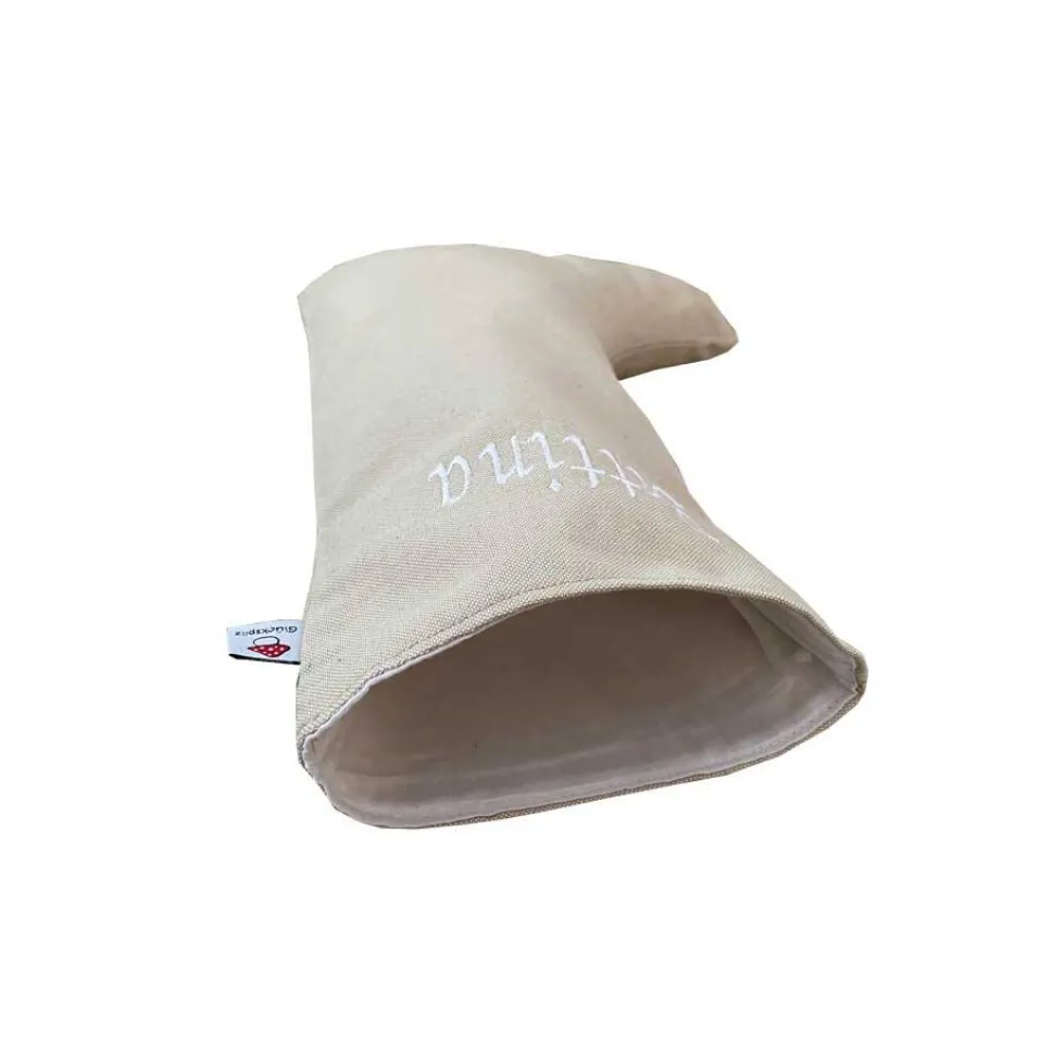 Die Nikolaussocke ist ca 40 cm hoch und komplett mit weißem Baumwollstoff gefüttert. Mit weißem Garn sticken wir euren Wunschnamen ein.