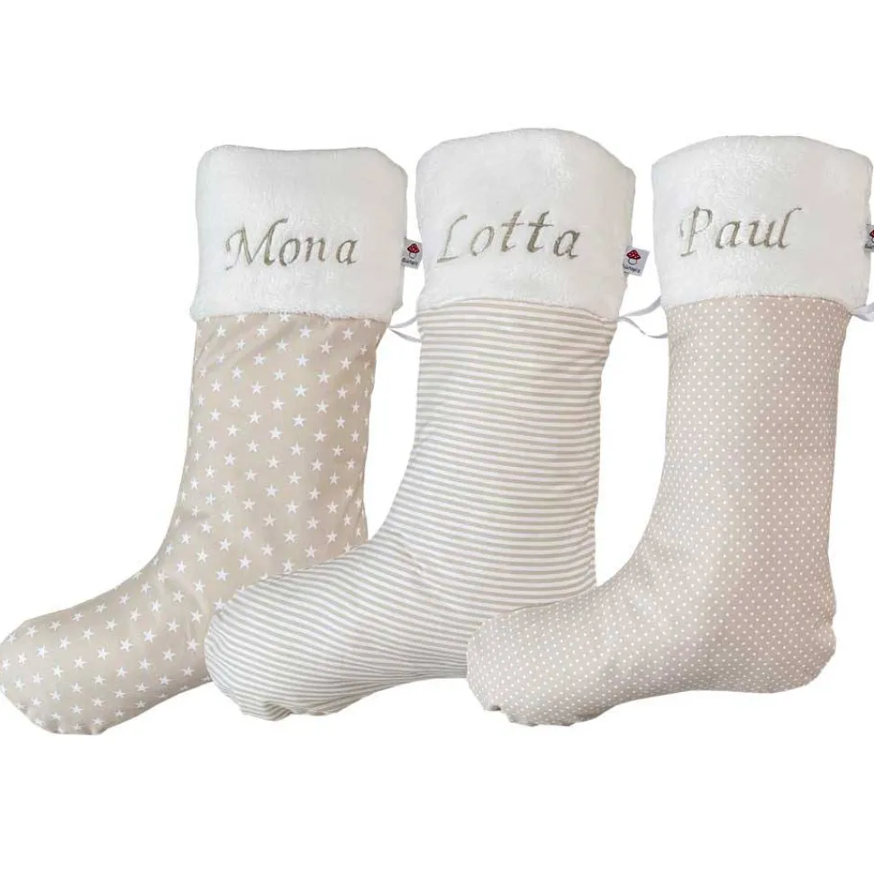 Er ist ca 44 cm hoch, weich wattiert und komplett gefüttert. Auf die Stulpe aus weichem Fleece sticken wir Ihren Wunschnamen. Dank einer Schlaufe kann der Weihnachtsstiefel mit Namen auch auf gehangen werden und ist somit einer wunderschöne, vorweihnachtlichen Dekoration. Da die Nikolaussocke waschbar ist, ist sie jedes Jahr auf’s neue zur Adventszeit wieder einsatzbereit. Vier verschiedene Farben und drei verschiedene Muster stehen zur Auswahl.