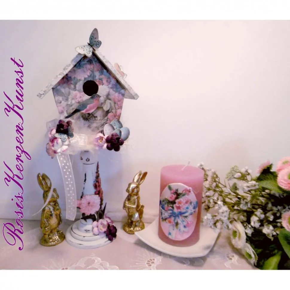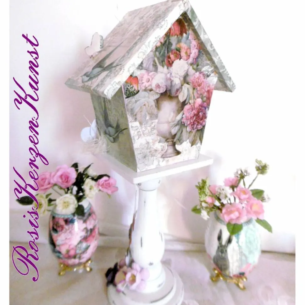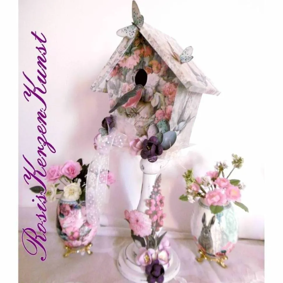 Wir haben ein Deko-Vogelhaus aus Holz mit edlem bunten Designpapier beklebt und mit weiteren Dekoelementen wie kleinen Blumen, Laser-Cuts aus edlen Designpapieren , Organzaband, Sisal , kleinen Schmetterlingen etc. dekoriert.