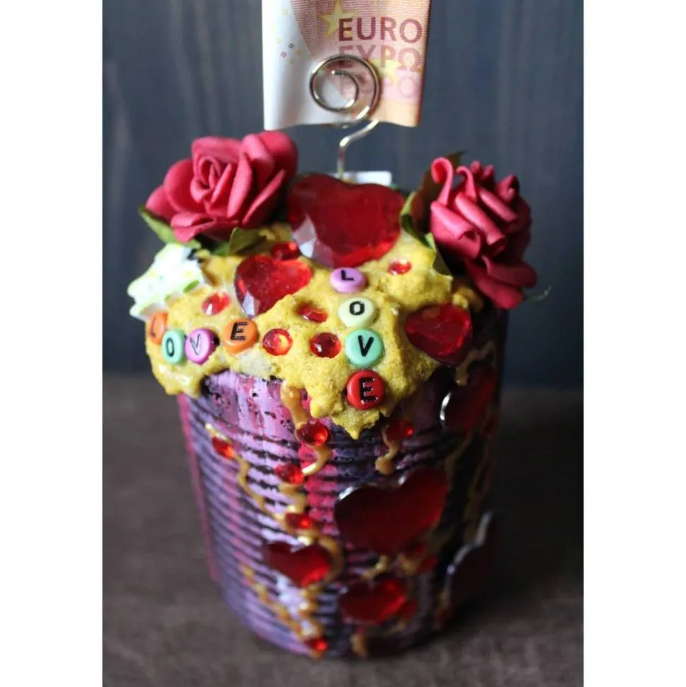 Ein aus Beton gegossenes Objekt in Form einer Konservendose. Künstlerisch gestaltet mit Acrylfarben im Shabby-Stil, in Rot, Rose und weiß. Verziert mit Schmucksteinen in Herzform, Kunstrosen und Kunststoffperlen mit dem Schriftzug LOVE, sowie Modeliermasse und Schmetterlinge aus Polyresin. Tolle Shabby-Effekte durch Lufteinschlüsse im Beton.