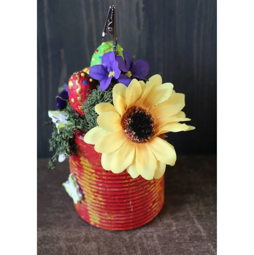 Ein aus Beton gegossenes Objekt in Form einer Konservendose. Künstlerisch gestaltet mit Acrylfarben im Shabby-Stil, in Rot, und Gelb. Bunt verziert mit Eiern, Kunstblumen und Islandmoos, sowie Schmetterlingen aus Polyresin. Tolle Shabby-Effekte durch Lufteinschlüsse im Beton.