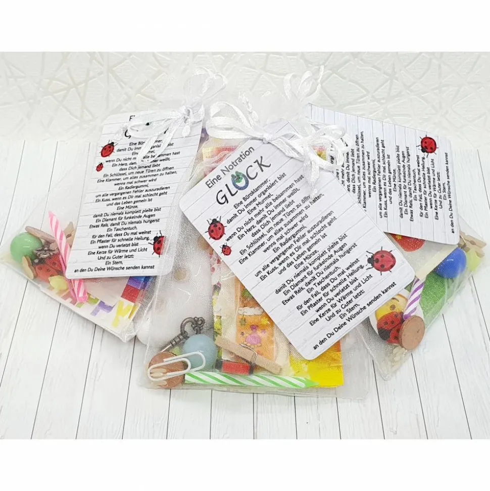 Das handliche Organzasäckchen passt bei Bedarf in jeden Briefkasten und enthält sorgfältig ausgewählte Gegenstände, die sich nur in Farbe oder Design unterscheiden. Ein angehängtes Kärtchen erklärt dem Empfänger die Bedeutung jedes einzelnen Inhalts der Notration Glück.