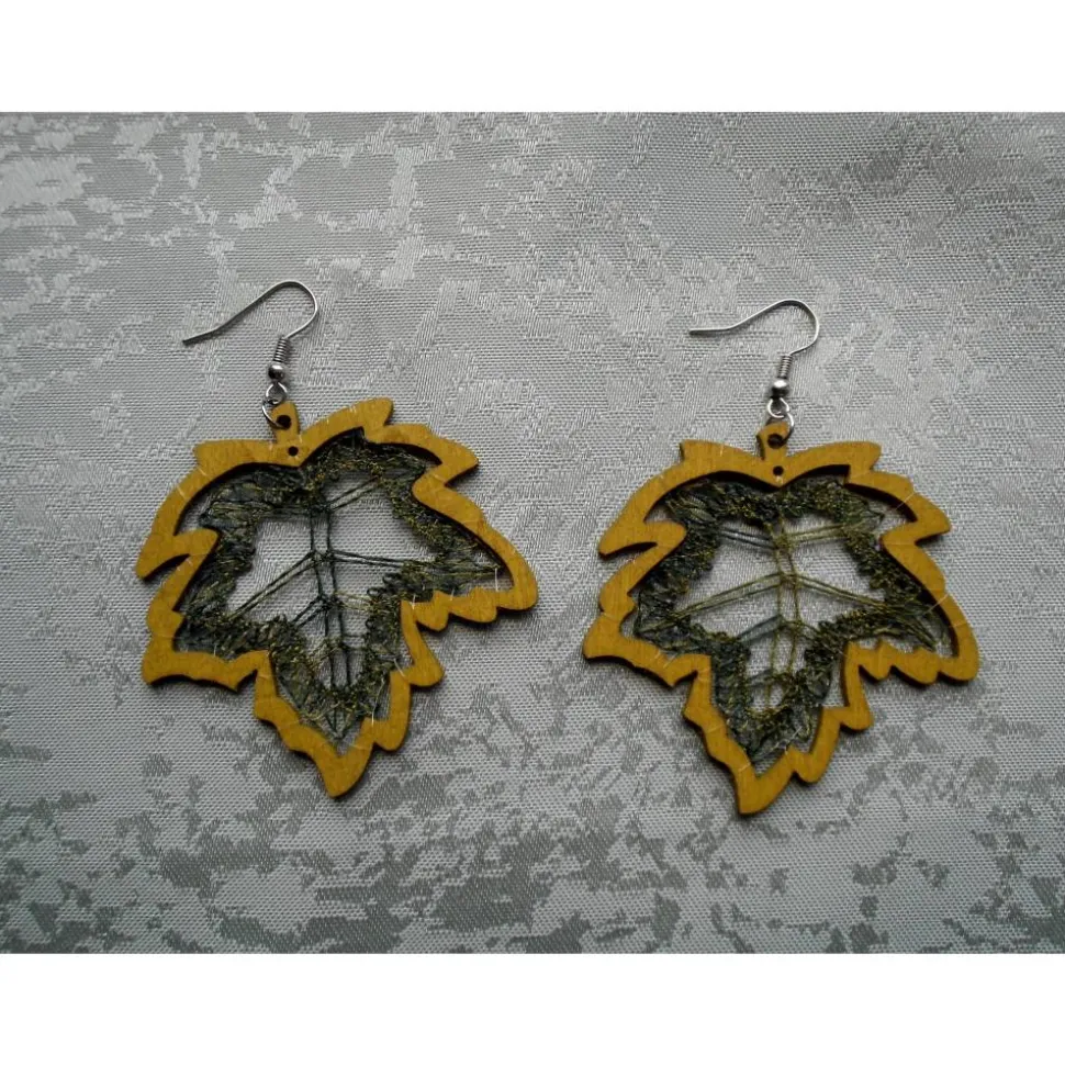 Die Klöppelarbeit habe ich mit einem dünnen Faden in die fertig gekauften Rahmen aus Holz eingenäht. Oben an den Rahmen habe ich Ohrhaken aus Metall befestigt.