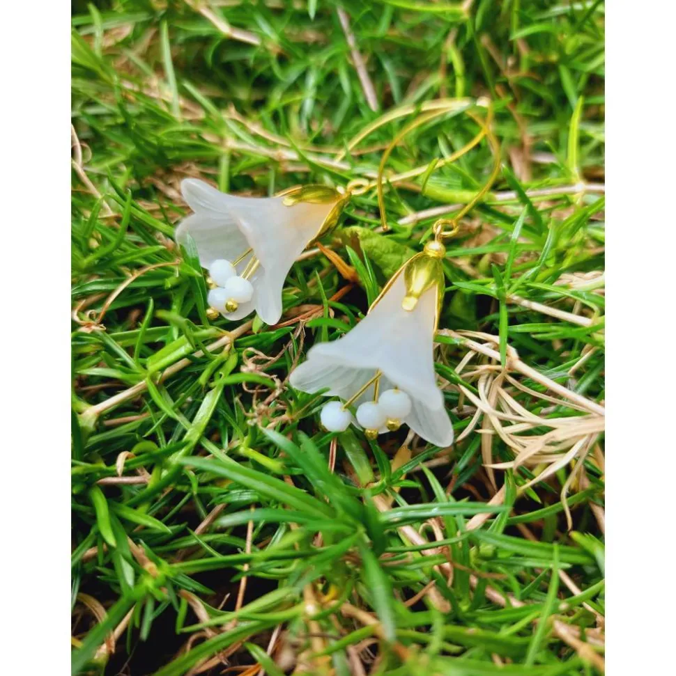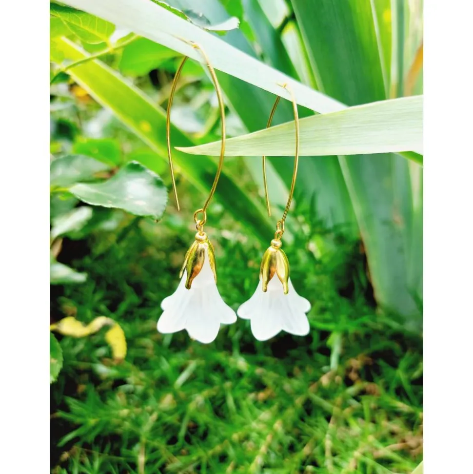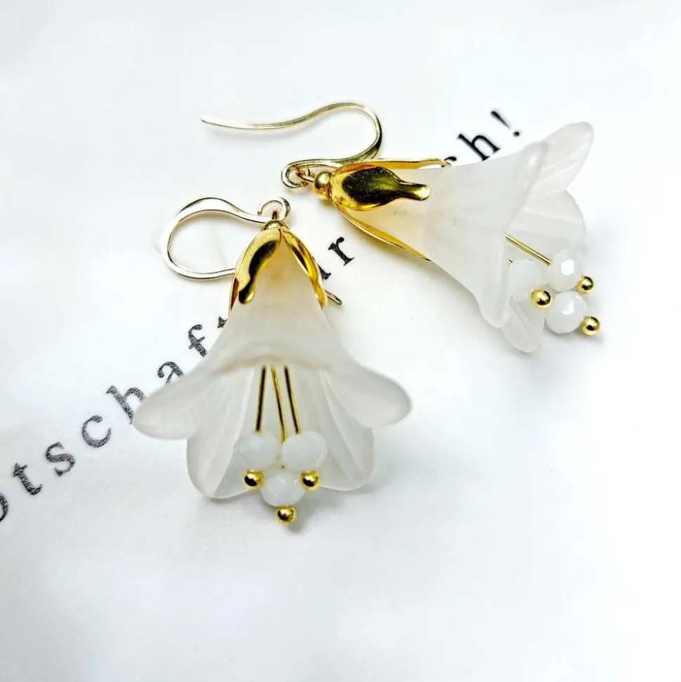 Material: Lucite Blüten gefrostet (Acrylglas), Metall (goldfarbene Perlkappen), Messing (Kugelnietstifte, kurze Ohrhaken), Kupfer (lange Ohrhaken), Edelstahl (Kettelstifte), Glasfacettperlen