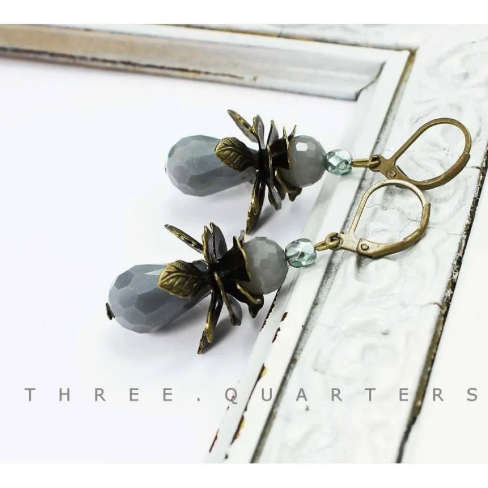 Ohrringe mit Tropfen Perlen in grau, dunkelgrau. Mit Metall Blumen in bronze und kleinen Perlen in türkis, eisblau.