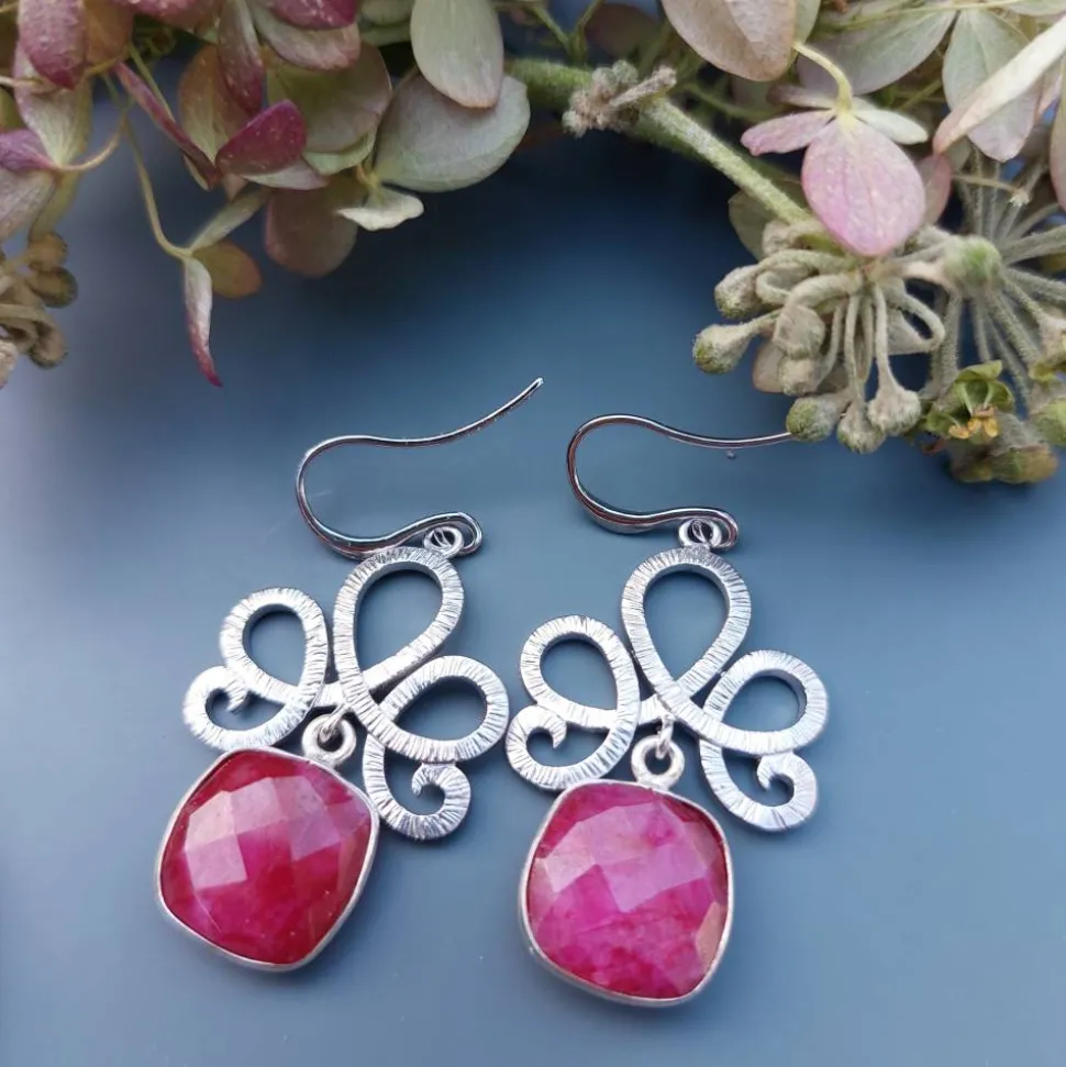 Material: Messing rhodiniert (Ohrhaken), Messing matt rhodiniert (Ornamente), Edelstein Rubin eingefasst in versilbertem Kupfer