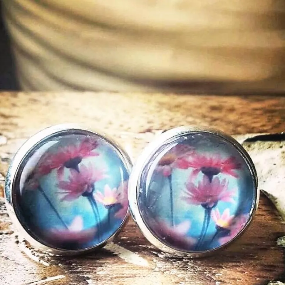Material: Glas, Papier, Kleber und Silikon. Bild ist zugekauft. Ohrschmuck aus Kupfer und dann mit silberfarbe beschichtet