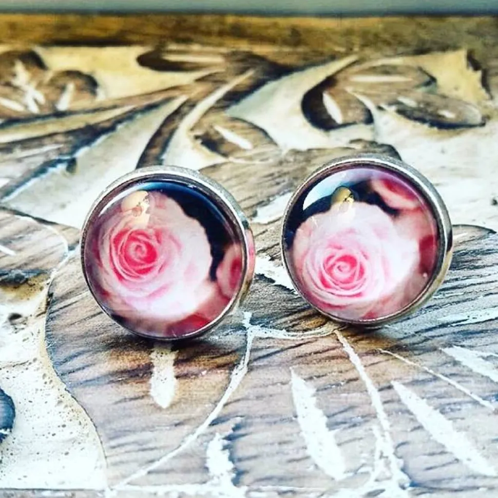 Material: Glas, Papier, Kleber und Silikon. Bild ist zugekauft. Ohrschmuck aus Kupfer und dann mit silberfarbe beschichtet