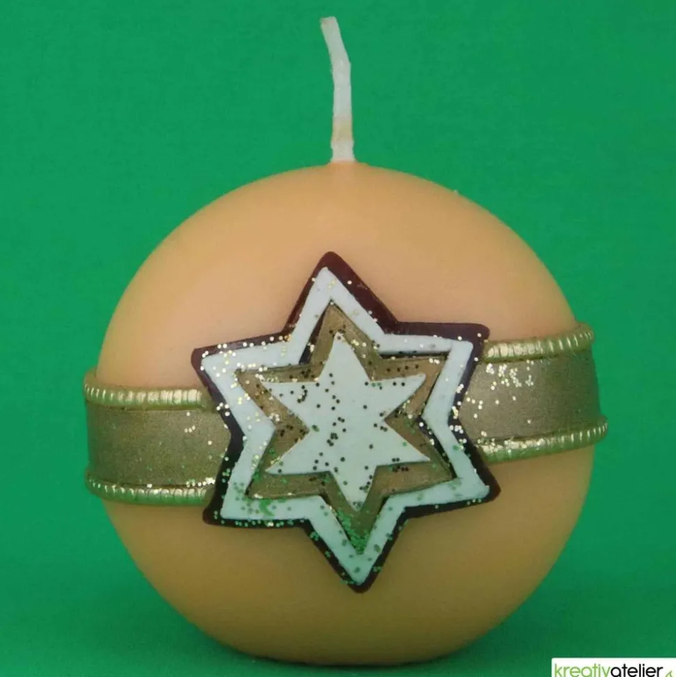 Meine Weihnachtskerzen werden aufwändig von Hand mit Wachs verziert. Der waagerecht umlaufende, goldene Wachsstreifen bildet die Basis für den mehrlagigen Stern. Er besteht aus mehreren kleinen, aufeinanderliegenden Sternen und hebt sich plastisch gut von der Kerze ab. Alle Ornamente werden einzeln von Hand aus verschiedenen Wachsplatten ausgeschnitten und kunstvoll auf der Kerze zu einem Bild arrangiert. Diese Weihnachtskerze wird in meinem Atelier individuell für Sie gefertigt.