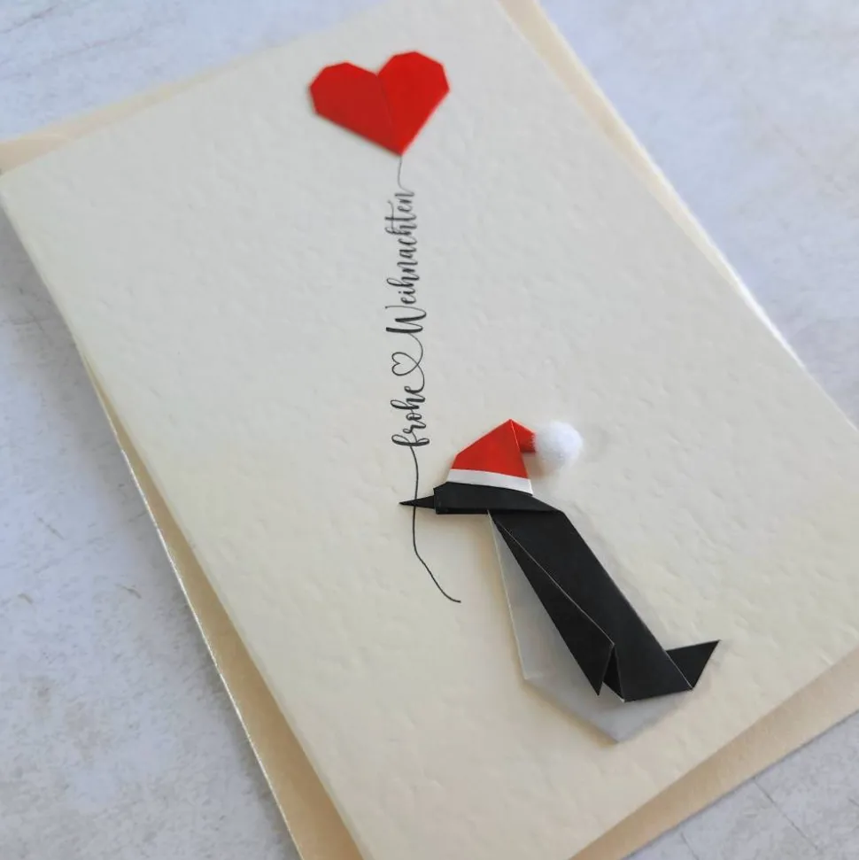 Bringe die festliche Stimmung direkt in die Herzen deiner Liebsten mit unserer handgefertigten Origami Karte Pinguin. Der Origami Pinguin steht für Freundschaft, Zusammenhalt und Wärme, eine wunderbare Botschaft für die Weihnachtszeit.
