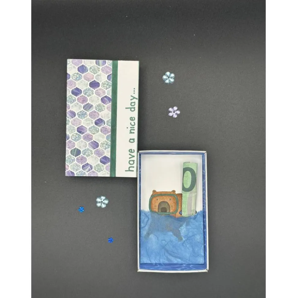Verpacke dein Geldgeschenk oder deinen Gutschein auf besondere Weise! Mit dieser handgemalten Capybara Box, die mit einer türkisfarbenen Taucherbrille fröhlich im Wasser plantscht, sorgst du garantiert für ein Lächeln beim Beschenkten.