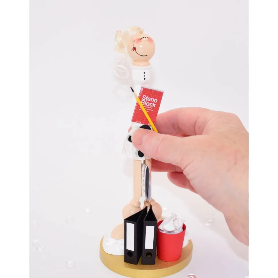Die kleine Sekretärin ist ca. 16,5 cm groß und steht auf einer 7 cm Durchmesser großen Grundfläche. Durch die liebevolle Herstellung in 100% Handarbeit entstehen echte Unikate, die jedes Geschenk besonders machen. Für die Figur werden ausschließlich hochwertige Materialien wie Holz, Holzkugeln, Karton, Puppenhaar, Schleifenband, Perlenpen, Acrylfarbe, Heißkleber, Alleskleber und Kordel verwendet.