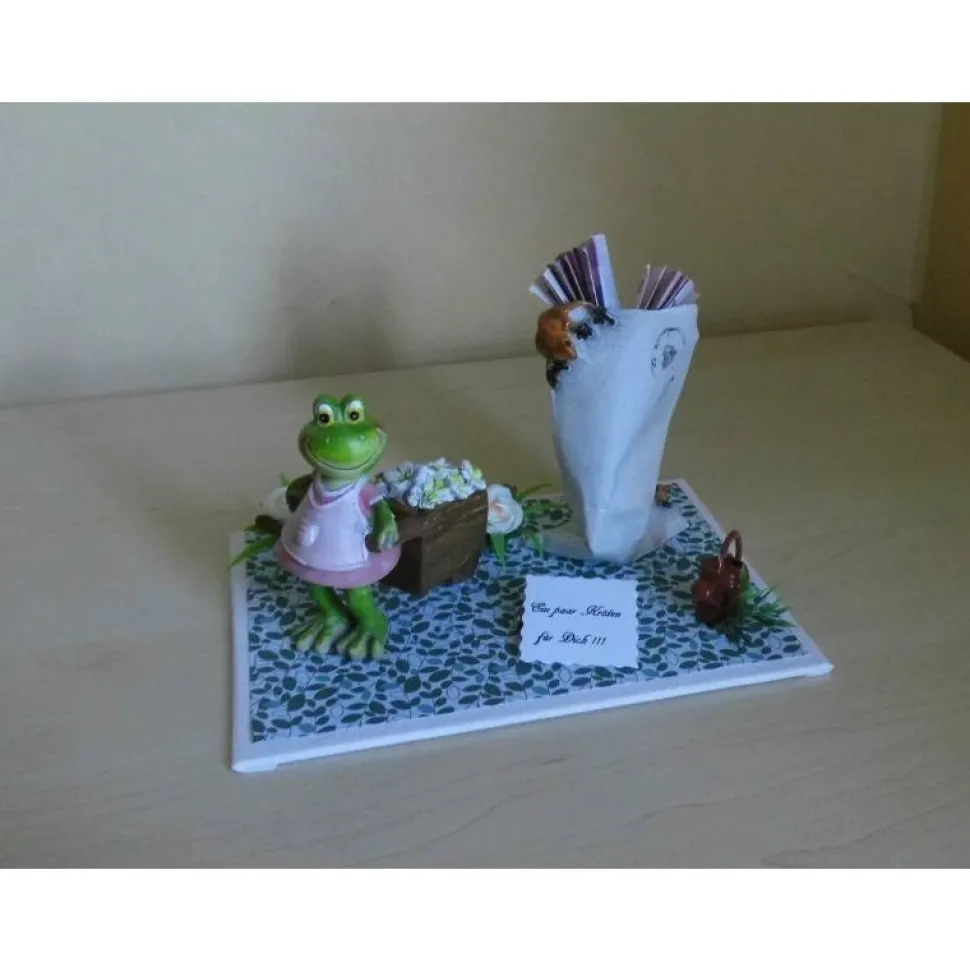 Mit dem Geldgeschenk Kröten für Dich machst du jeder Gärtnerin zum Geburtstag eine große Freude. Auf einer Malunterlage mit Blattmotiv sind liebevoll arrangierte Dekoelemente platziert. Der geöffnete Briefumschlag bietet Platz für Geldscheine, einen Schokoriegel oder kleine Überraschungen.
