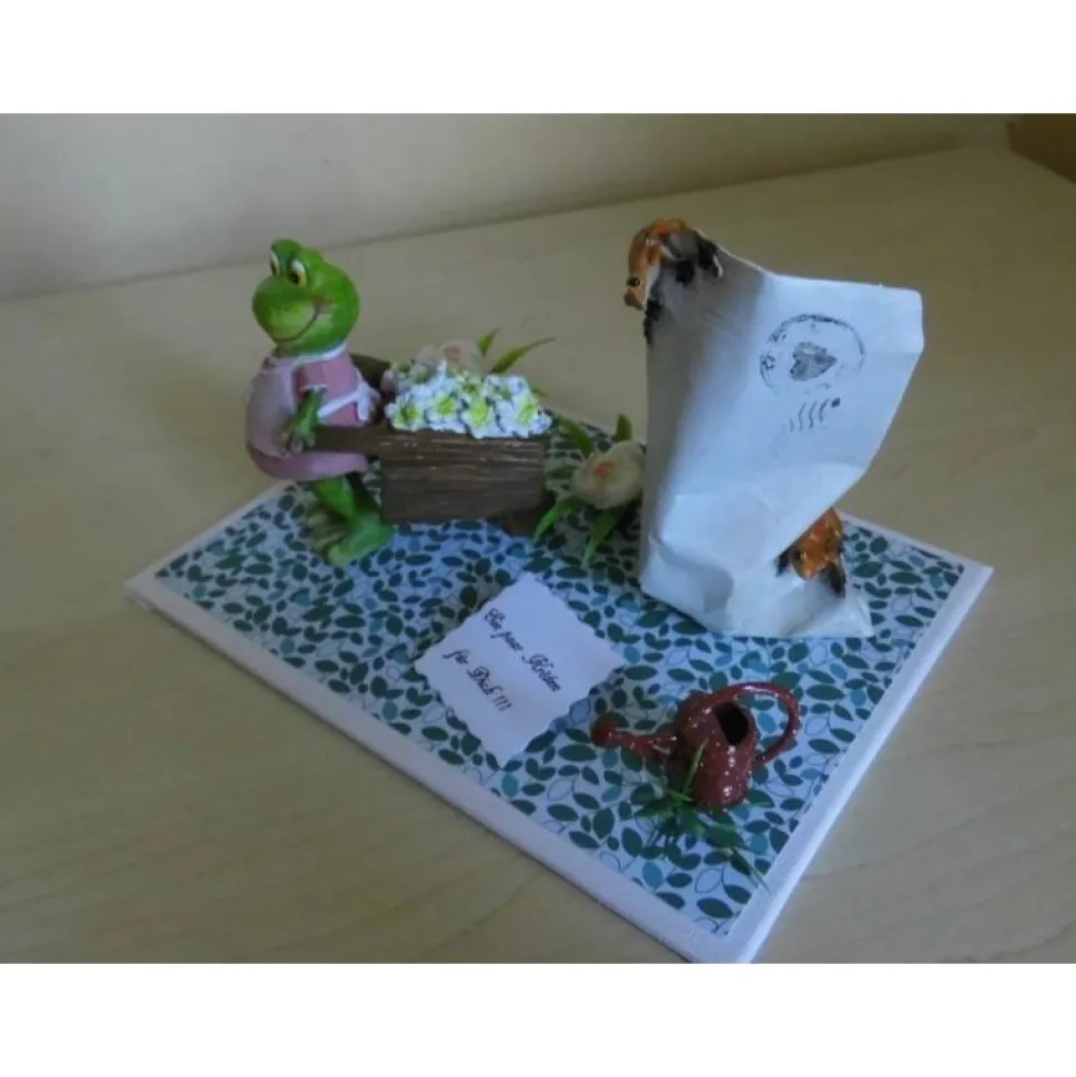 Zwei kleine Kröten zieren die Ecken des Umschlags und ein dicker Frosch mit Schubkarre voller Blumen rundet die Gartenszene ab. Die Aufschrift Ein paar Kröten für Dich !!! sorgt garantiert für ein Lächeln beim Beschenkten.