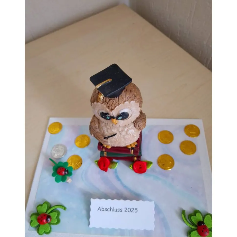 Verschenke ein besonderes Geldgeschenk zum Schulabschluss oder Abitur: Die Eule mit Doktorhut steht als Symbol für Weisheit und Erfolg. Der Malkarton dient als stilvolle Unterlage für die Eule sowie die liebevoll zusammengestellte Deko mit Geldklammer und Glücksklee. Der Geldschein kann einfach an der dekorativen Klammer befestigt werden – perfekt ergänzt durch aufgeklebte „Taler“ als optisches Highlight.