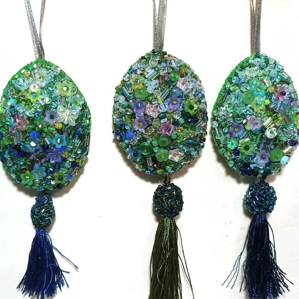 Ornament grün blau Unikat Perlenstickerei handgemacht Prunkei pompös handmade Wohndeko
