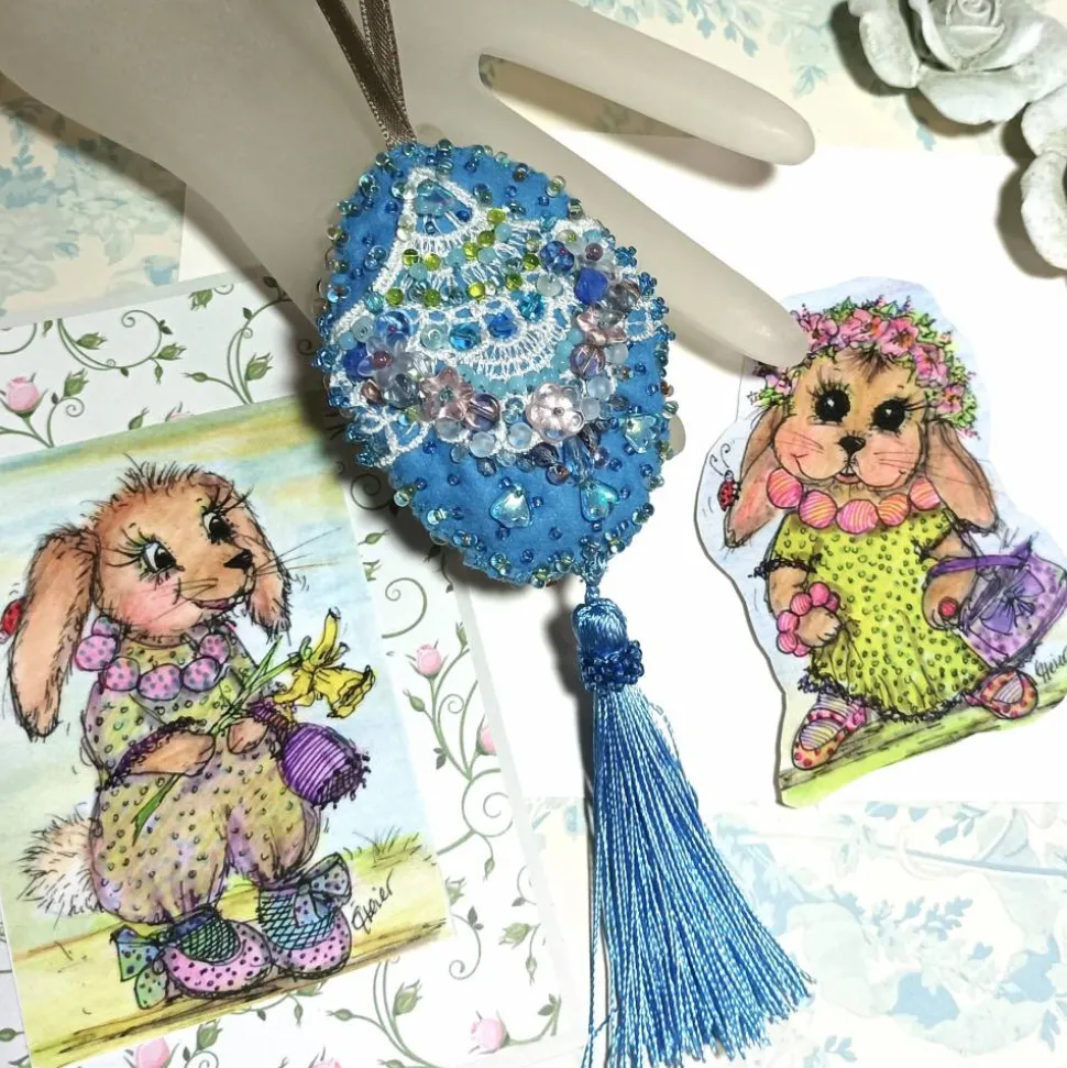Die besondere Osterdeko ist dies festlich glitzernde komplett handgemachte und hochwertig handbestickte Ei als Luxusausführung. Als Luxus Dekoration mit Glasblüten in pastell bunt und silberfarbenen Schmetterlingrn und Libelle verziert funkelt es am Osterstrauss. Komplett von Hand gemacht und in der Opulenz auffälliges sehr aufwändig von mir handbesticktes Osterei mit einer Vielzahl Roccailles verschiedener Art aus Glas gemixt mit Akzenten aus antiken Glasperlen, schimmernden weißen Süßwasserzuchtperlen und Blütenperlen in Nuancen von türkis, blau lavendel und hellrosa werden in dieser Luxus Wohndeko harmonisch in Szene gesetzt.. Das Ei kann am Satinband in schimmerndem khaki ausfgehängt werden. Jedes prunkvolle Osterei ist ein Unikat, ein von mir mit Liebe gefertigtes Einzelstück. Besonders schön lassen sich einzelne handbestickte persönliche Buchstaben und Zahlen zum Osterei im Strauss kombinieren. Es sieht toll und sehr wertig aus auch als Wanddeko. Die Bestellung bezieht sich auf genau dieses eine abgebildetenOsterei in blau türkis mit der üppigen perlenverzierten Quaste.
