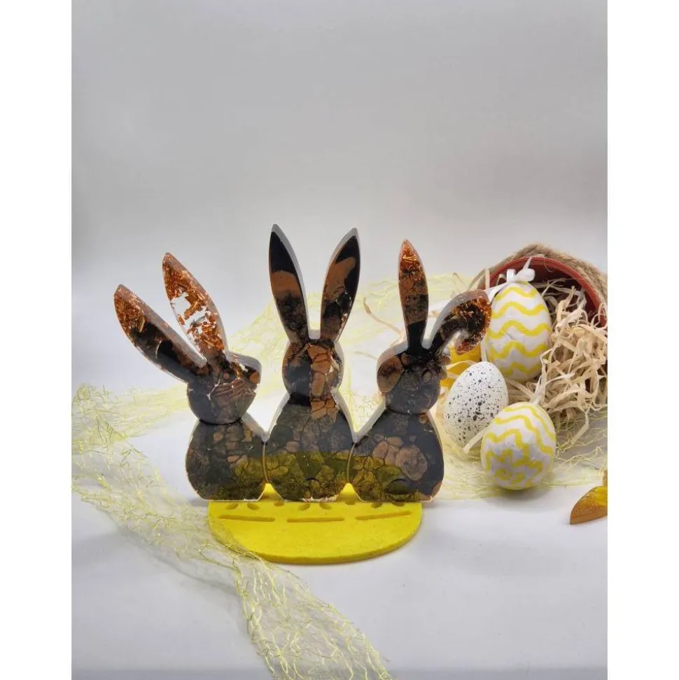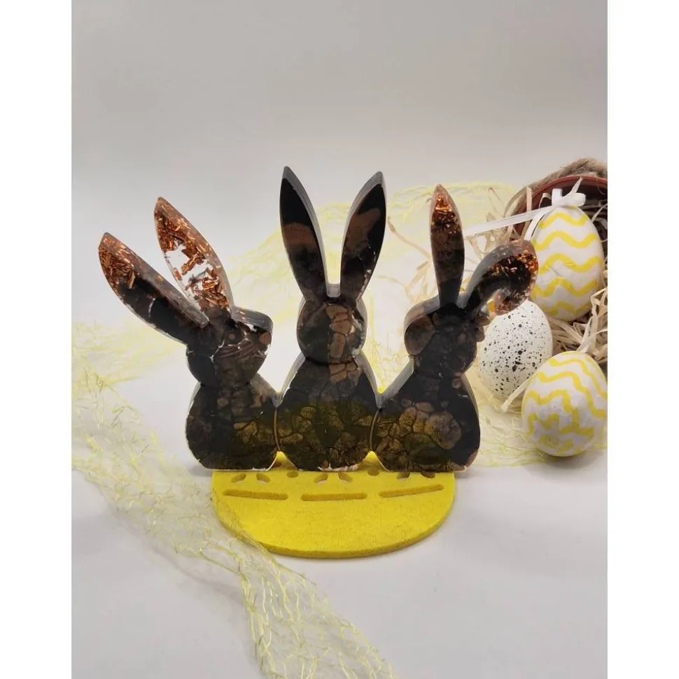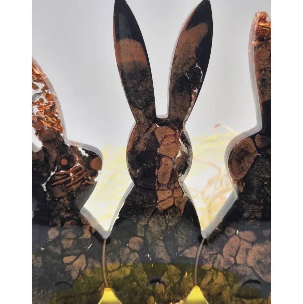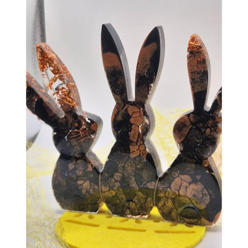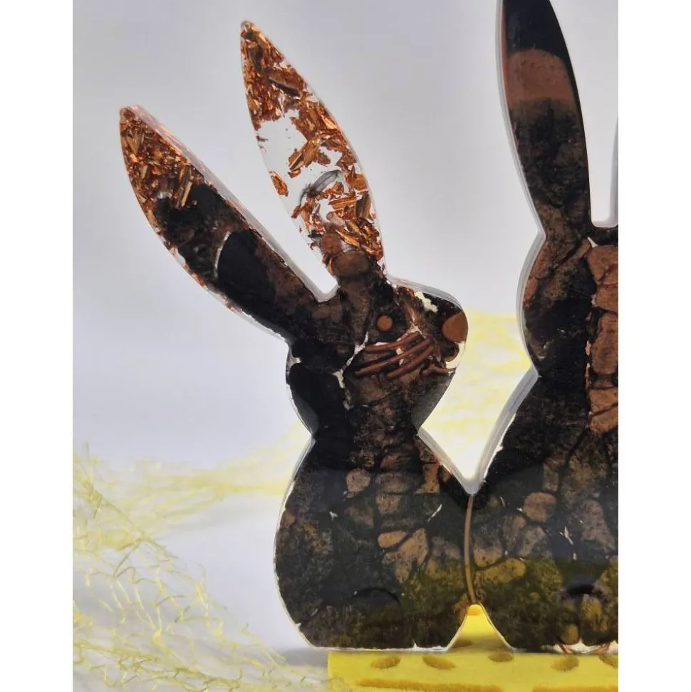 Diese edlen Hasen sind ein echter Blickfang für deine Oster- und Frühlingsdeko. In liebevoller Handarbeit aus Epoxidharz gefertigt, vereinen sie tiefes Schwarz mit warm schimmernden Kupferakzenten und Blattmetall. Jedes Stück ist ein Unikat – die Muster und Effekte entstehen zufällig und machen jeden Hasen einzigartig.