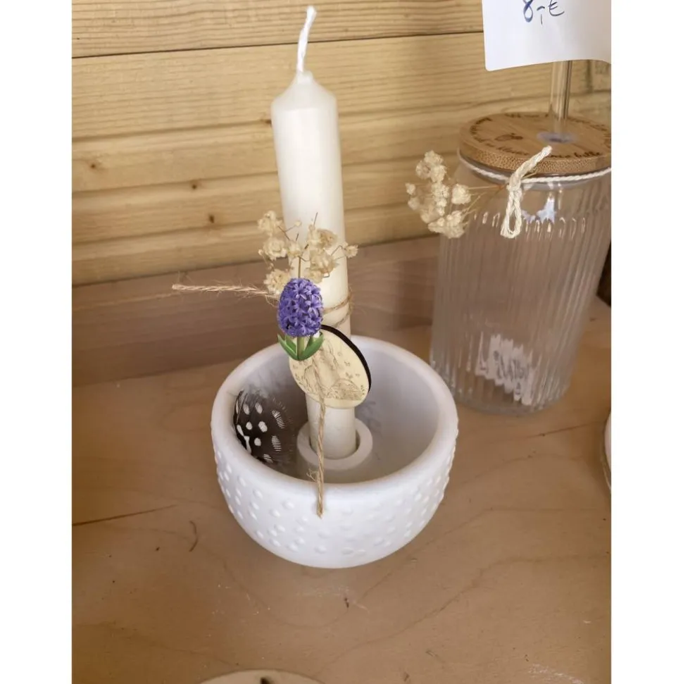 Die schlichte Stabkerze wird mit feinen Trockenblumen, natürlichen Materialien und einem liebevollen Osteranhänger stilvoll verziert und macht das Arrangement zu einem besonderen Blickfang.