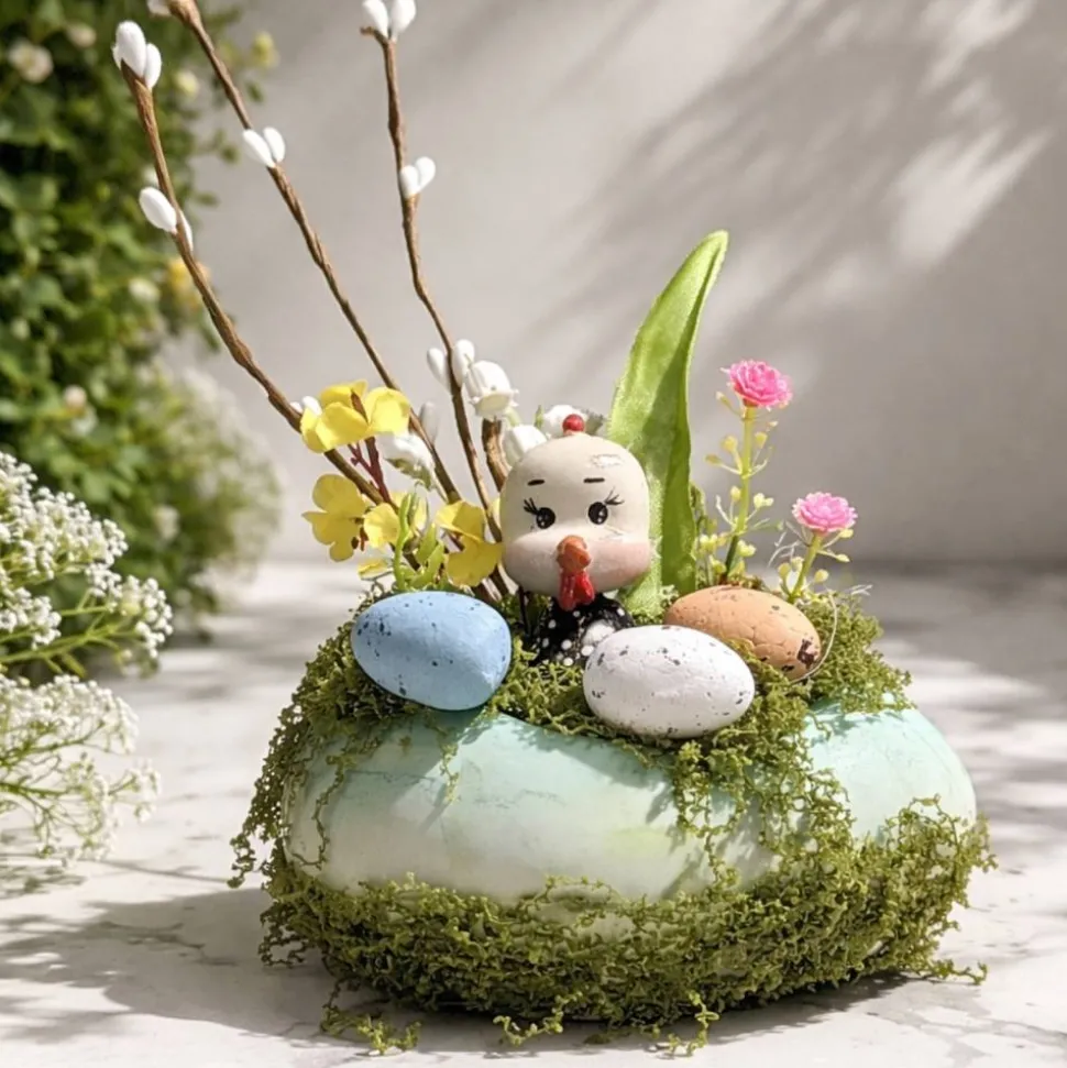 Geschmückt wurde sie mit schönen Kunstblumen, Ostereier und einem Osterküken der aus einer Eierschale, aus dem Gras auf die Welt schaut.