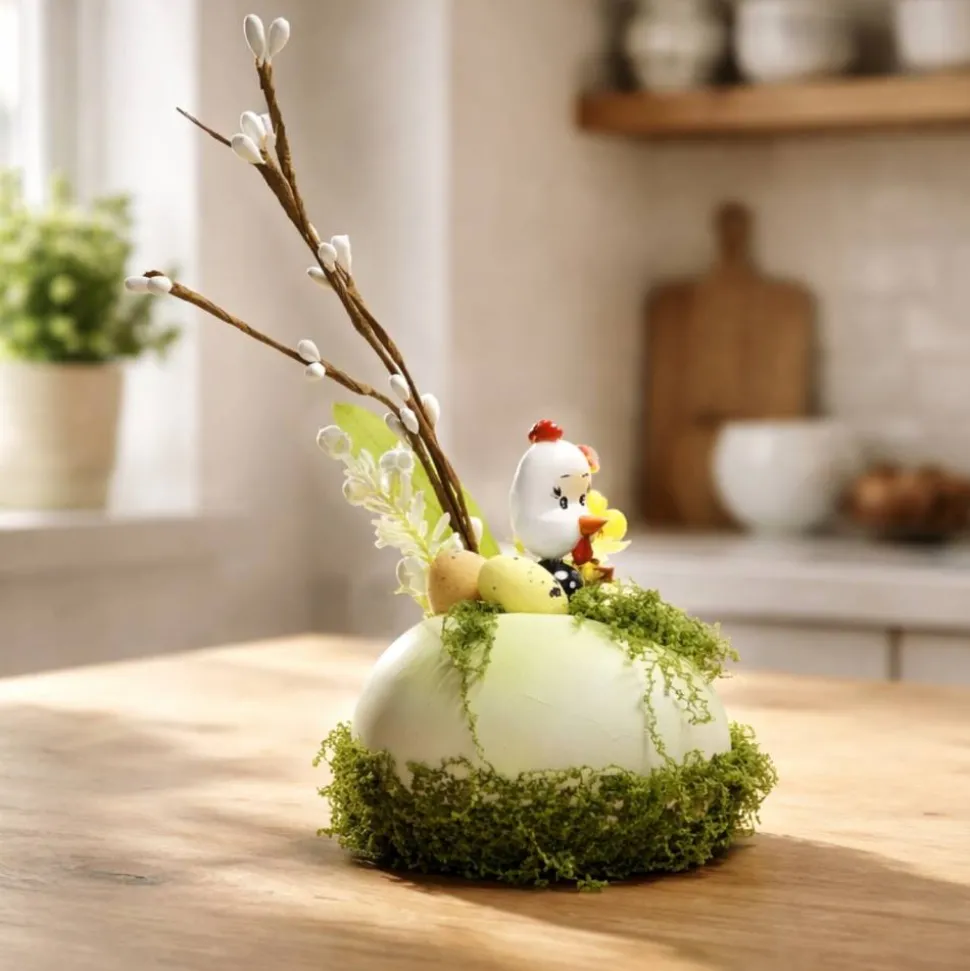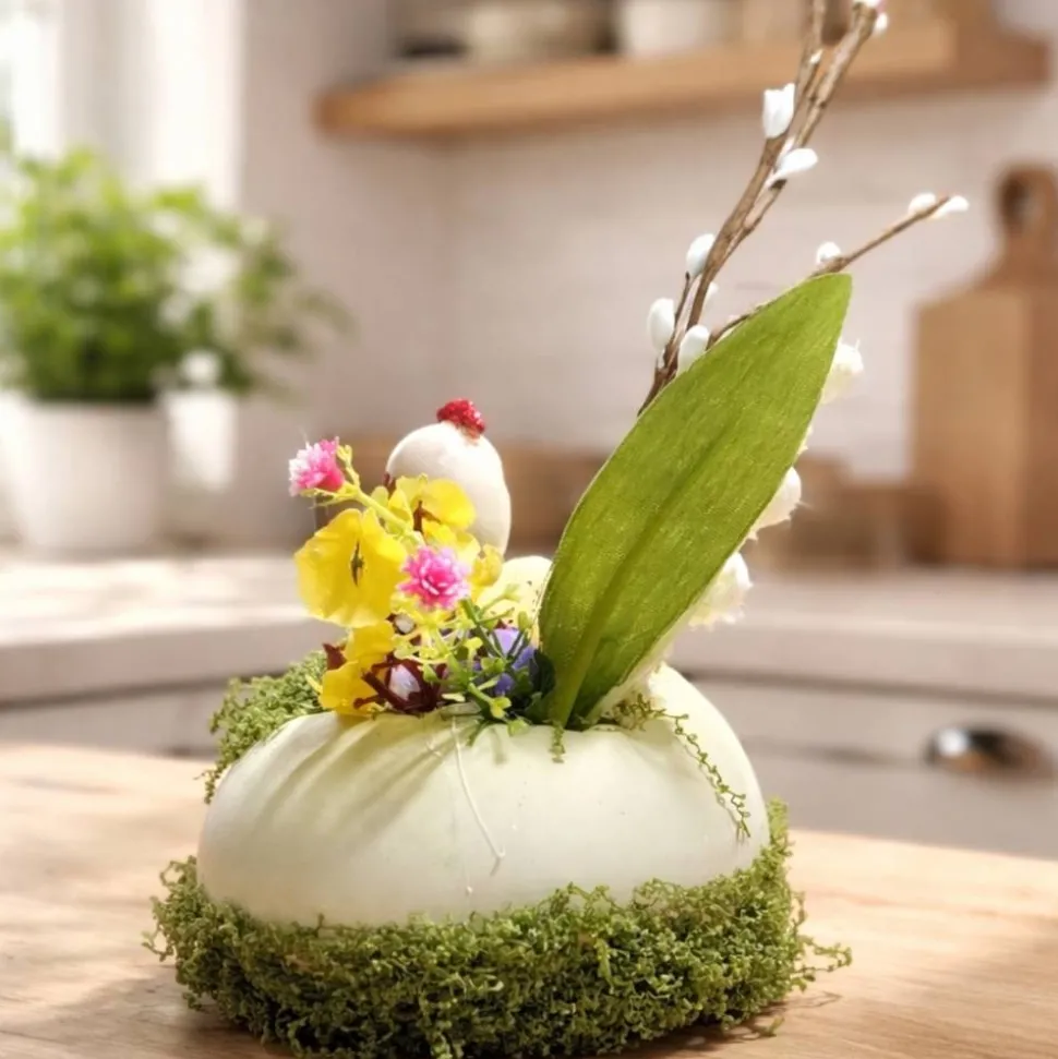 Geschmückt wurde sie mit schönen Kunstblumen, Ostereier und einem Osterküken der aus einer Eierschale, aus dem Gras auf die Welt schaut.